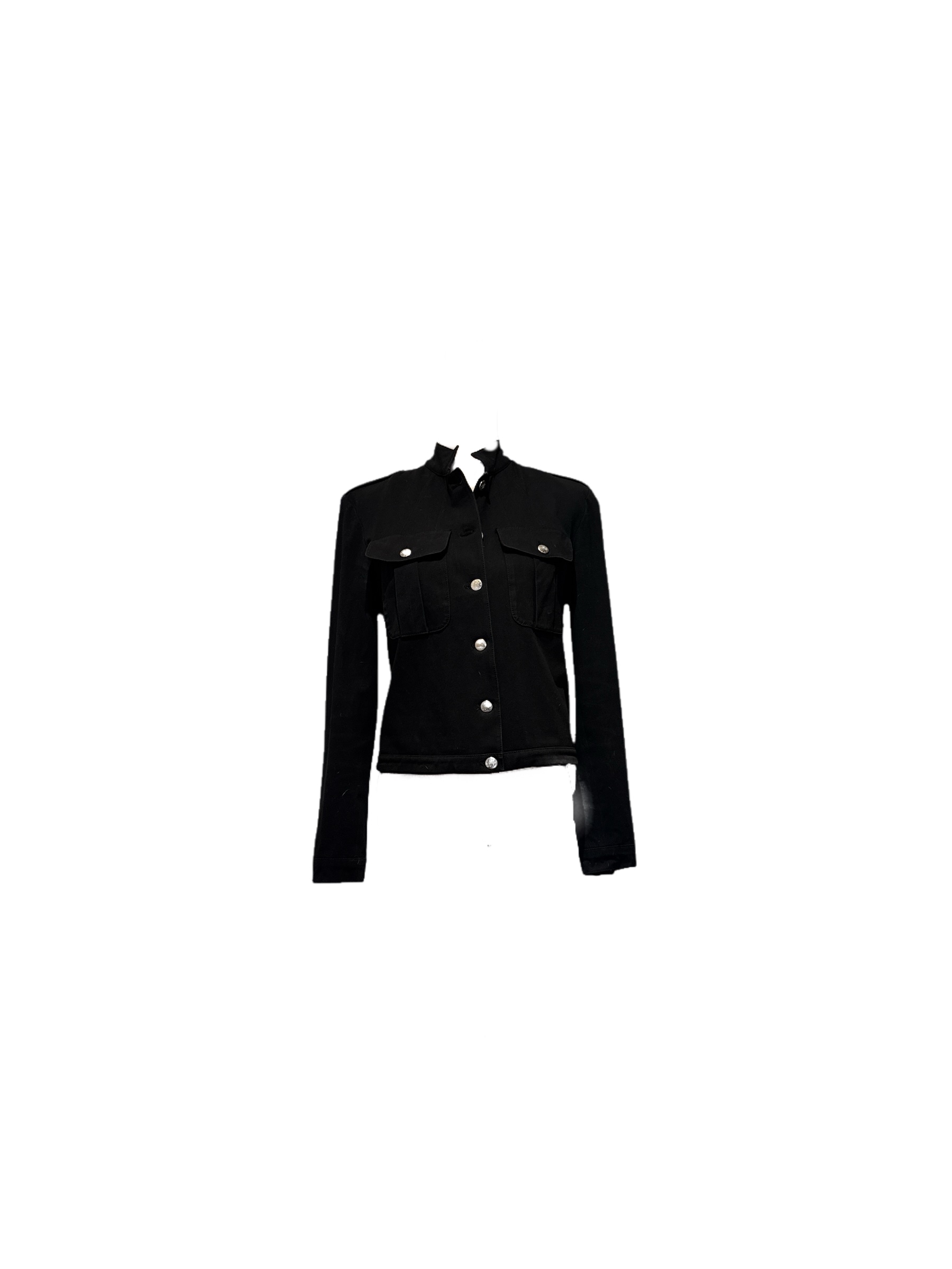 Chiusura frontale con bottoni metallici logati, colletto classico.