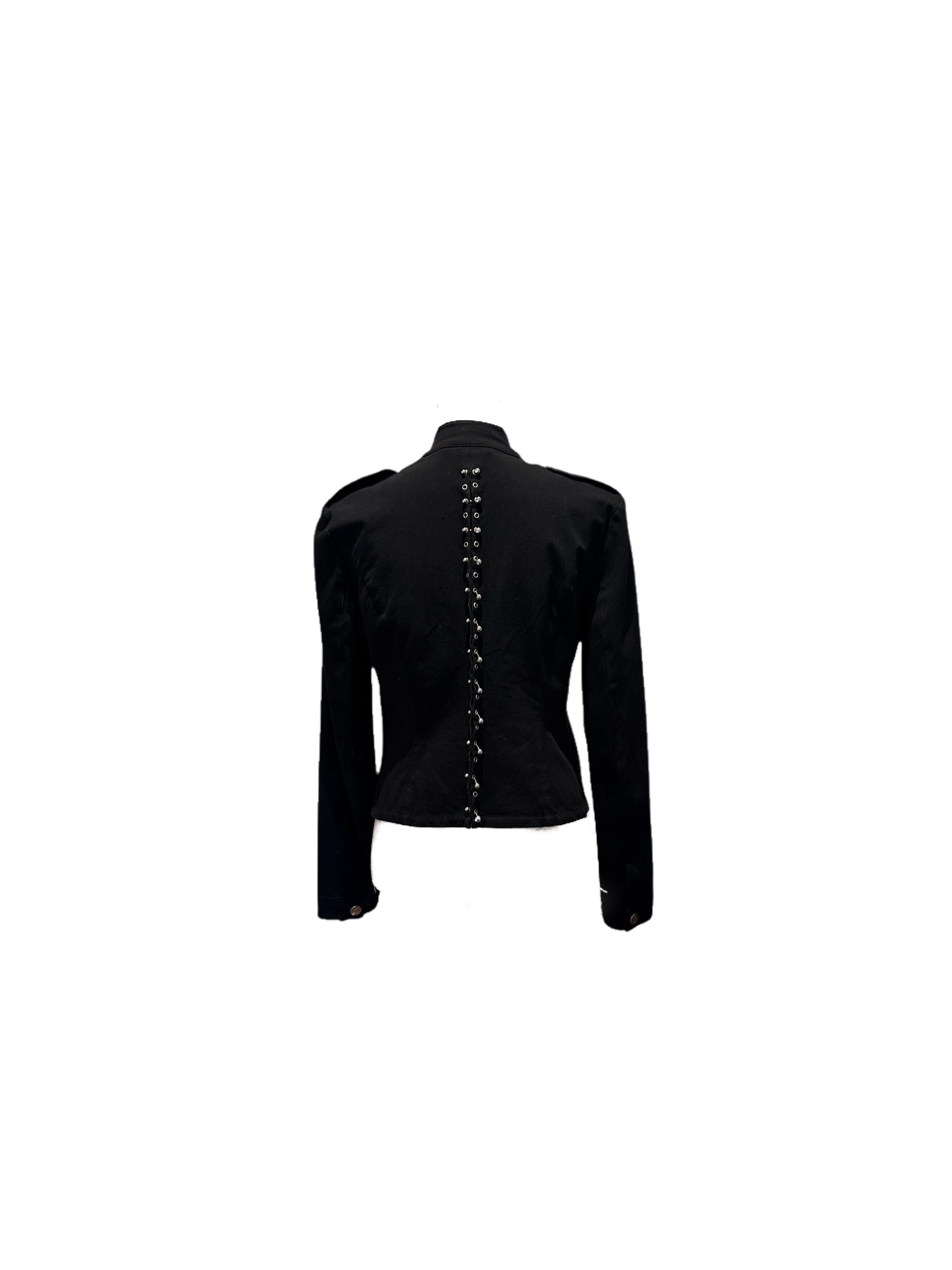 Il retro è il dettaglio più distintivo realizzato con una doppia fila centrale di occhielli metallici con strass.