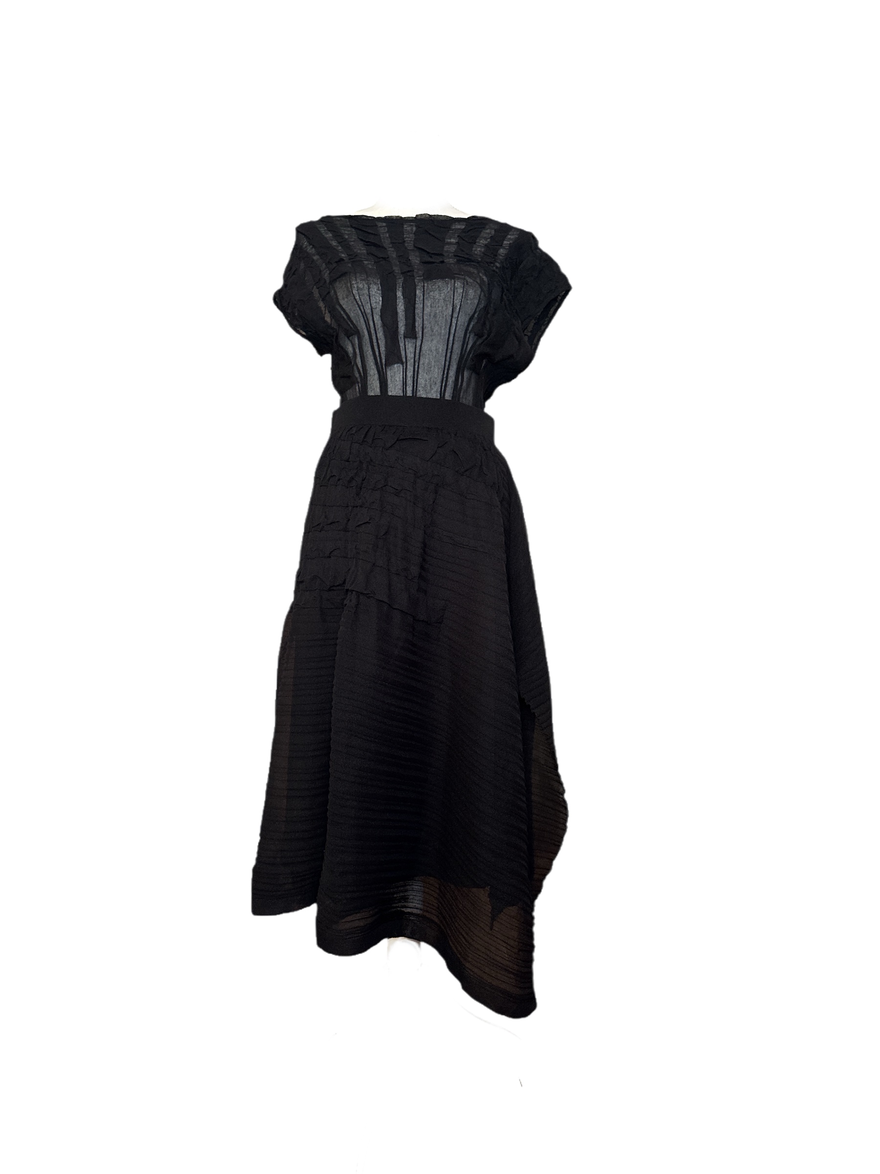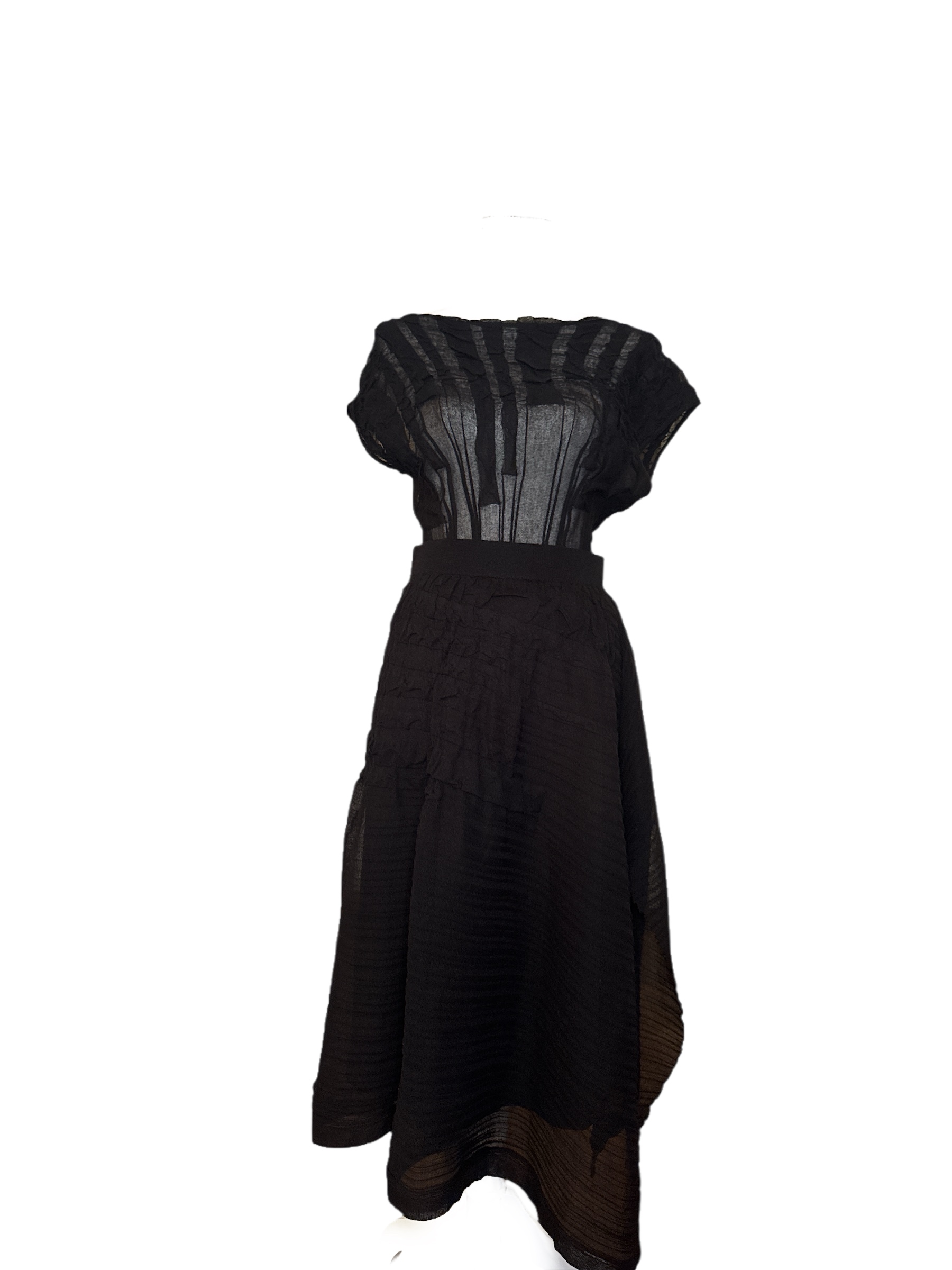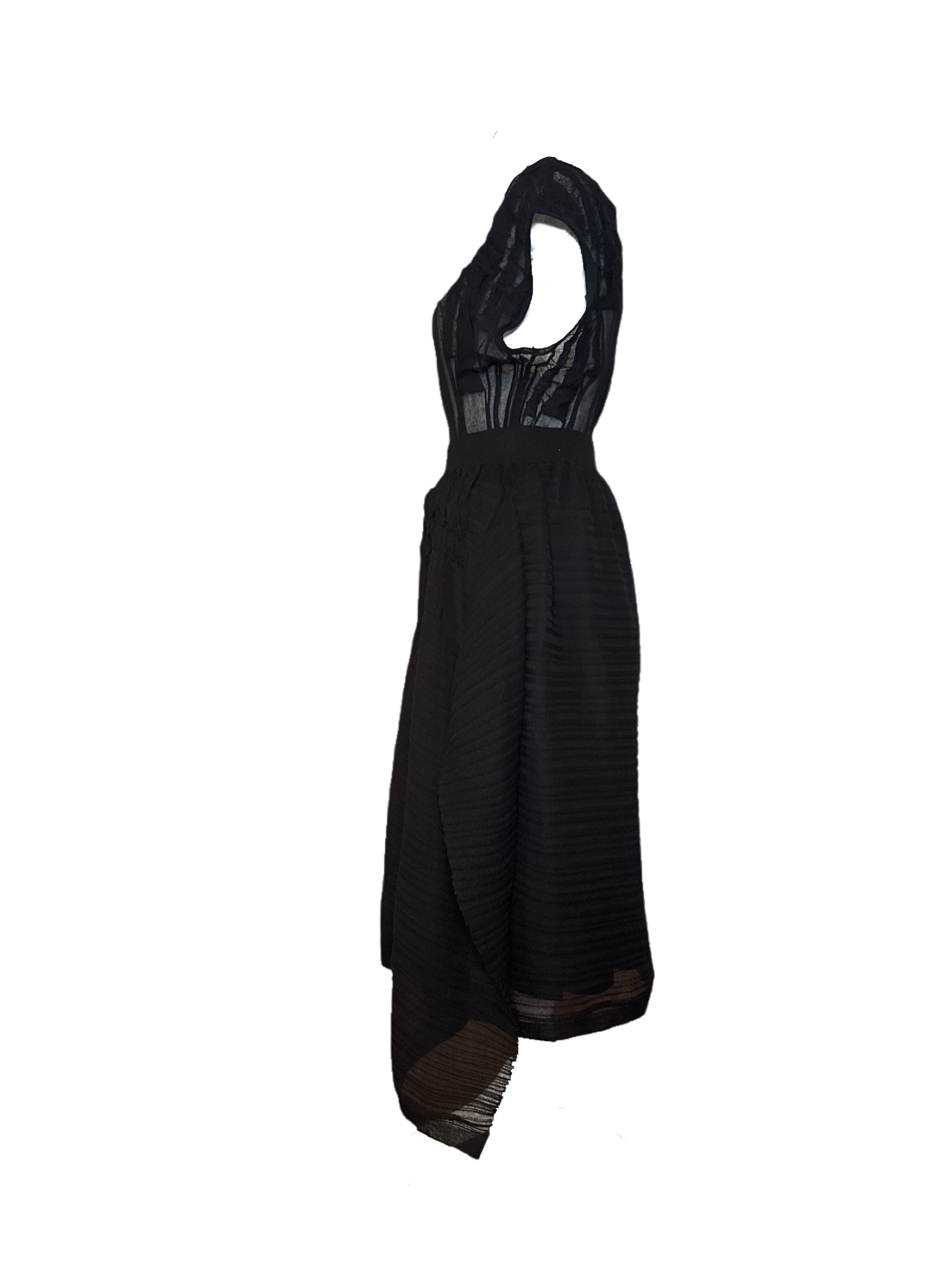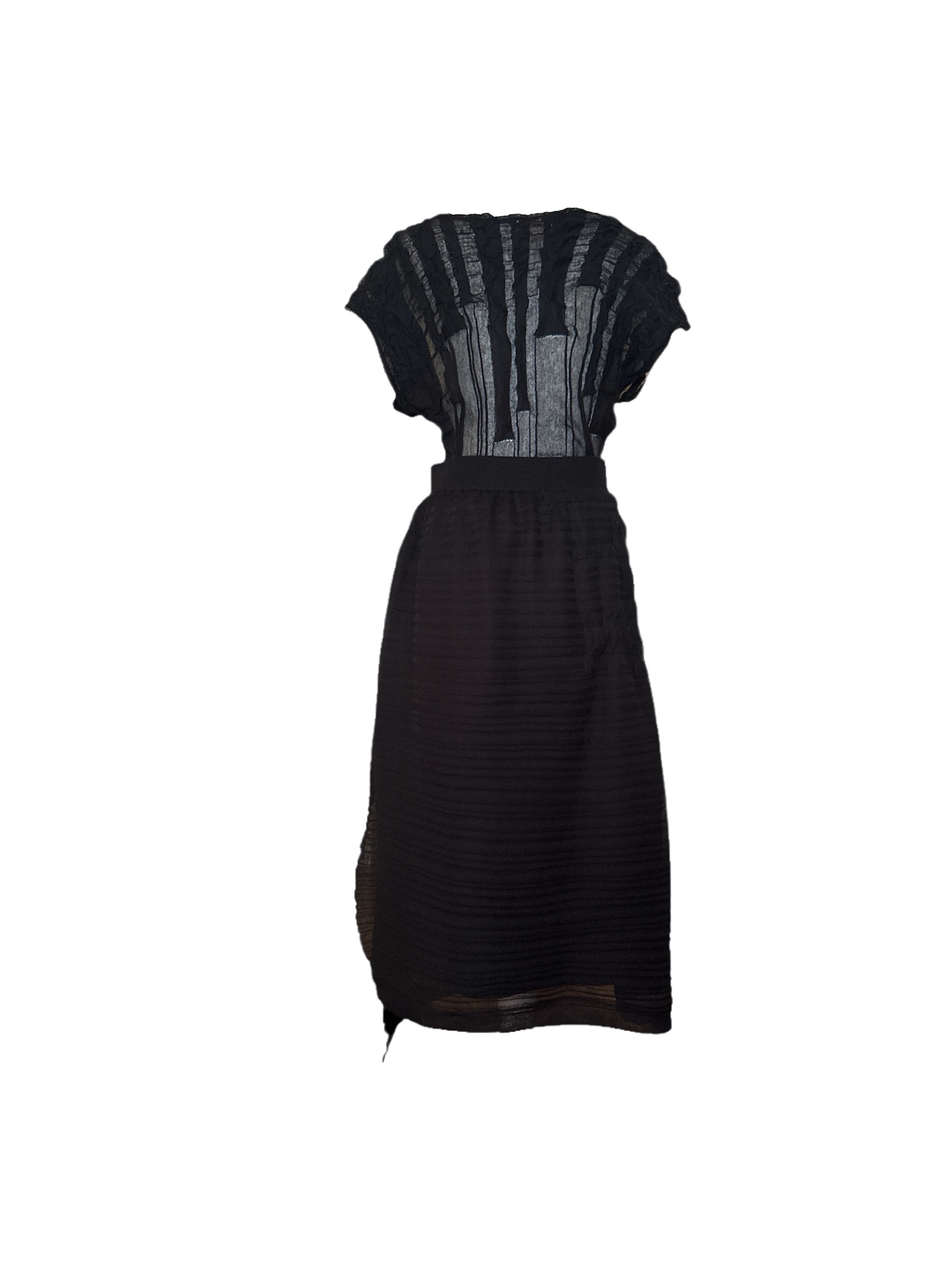 Corpetto trasparente con pannelli verticali in tessuto plissettato, maniche corte leggermente arricciate.