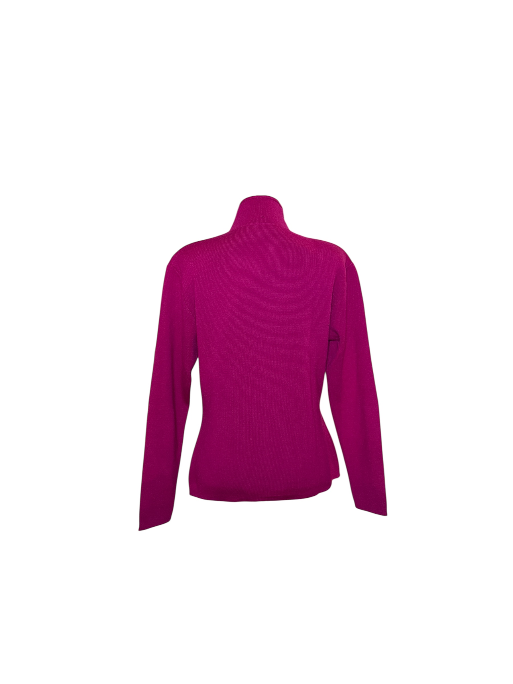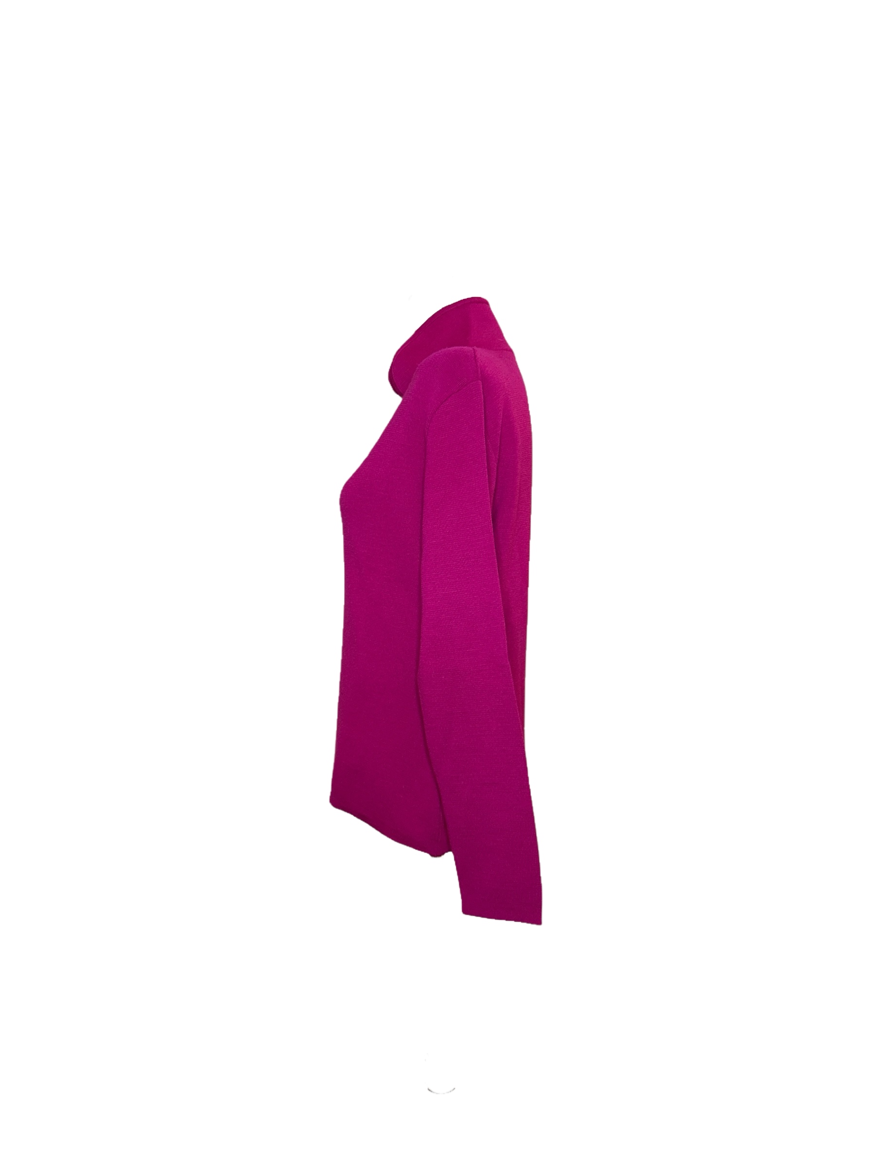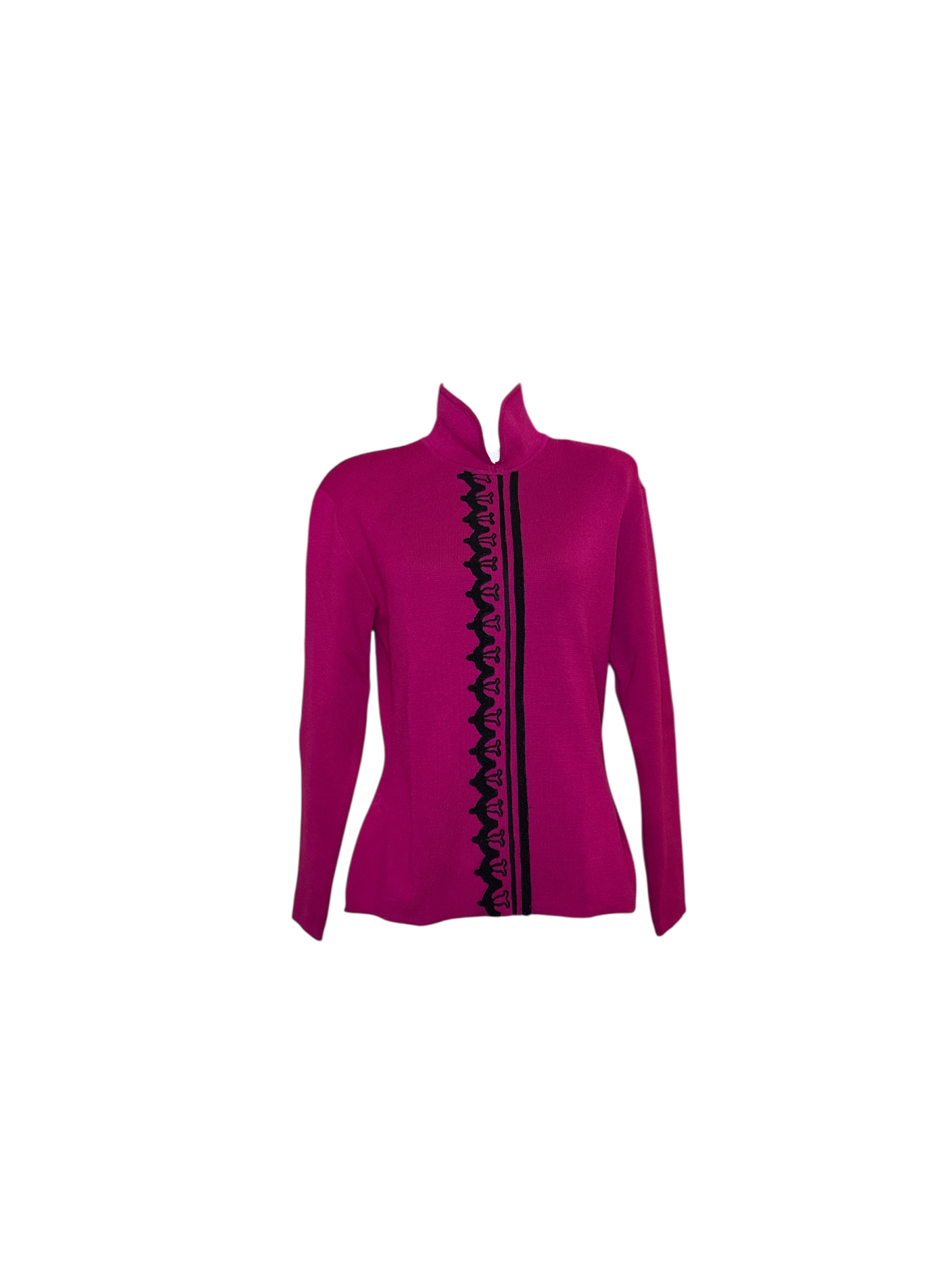 Maglione in lana con collo alla coreana leggermente aperto sul davanti e decorazione centrale in contrasto nero con motivo geometrico stilizzato.