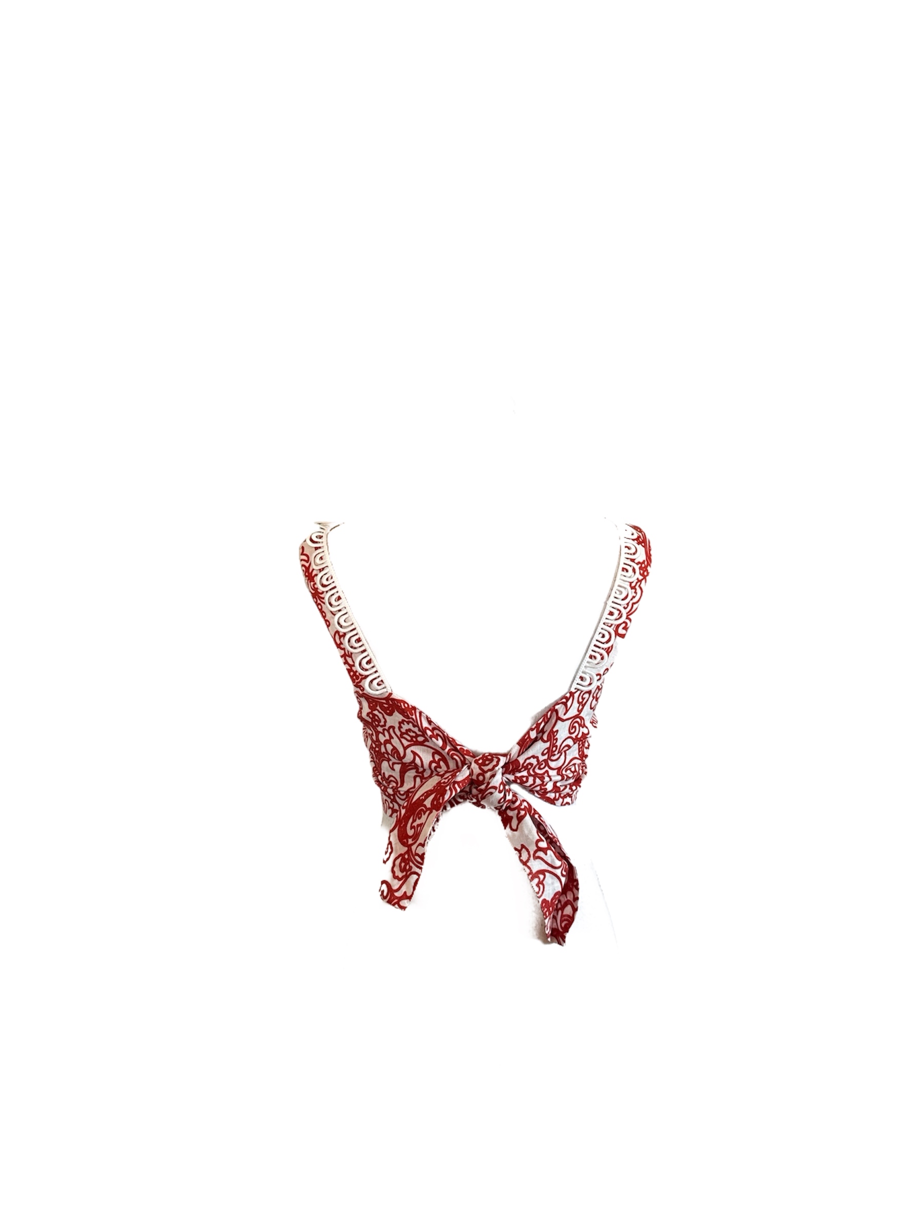 Top crop con fantasia rossa su base bianca, realizzato in lino.
