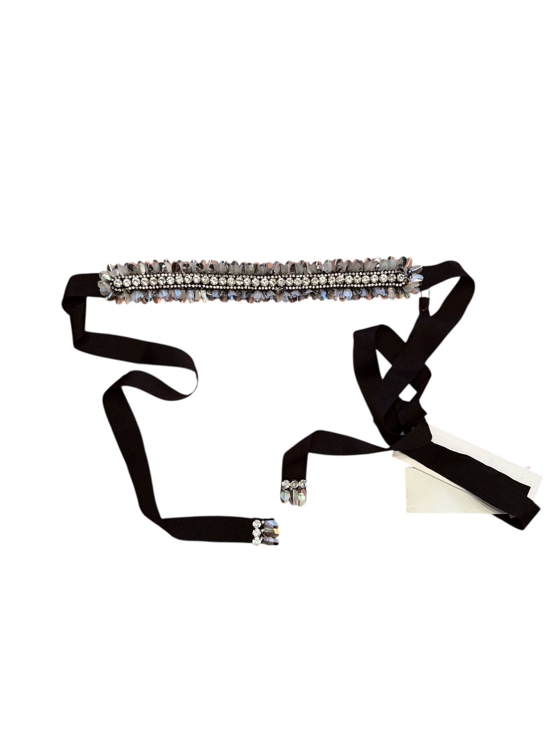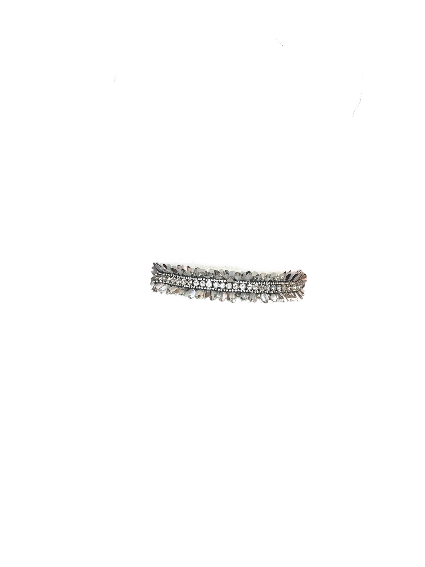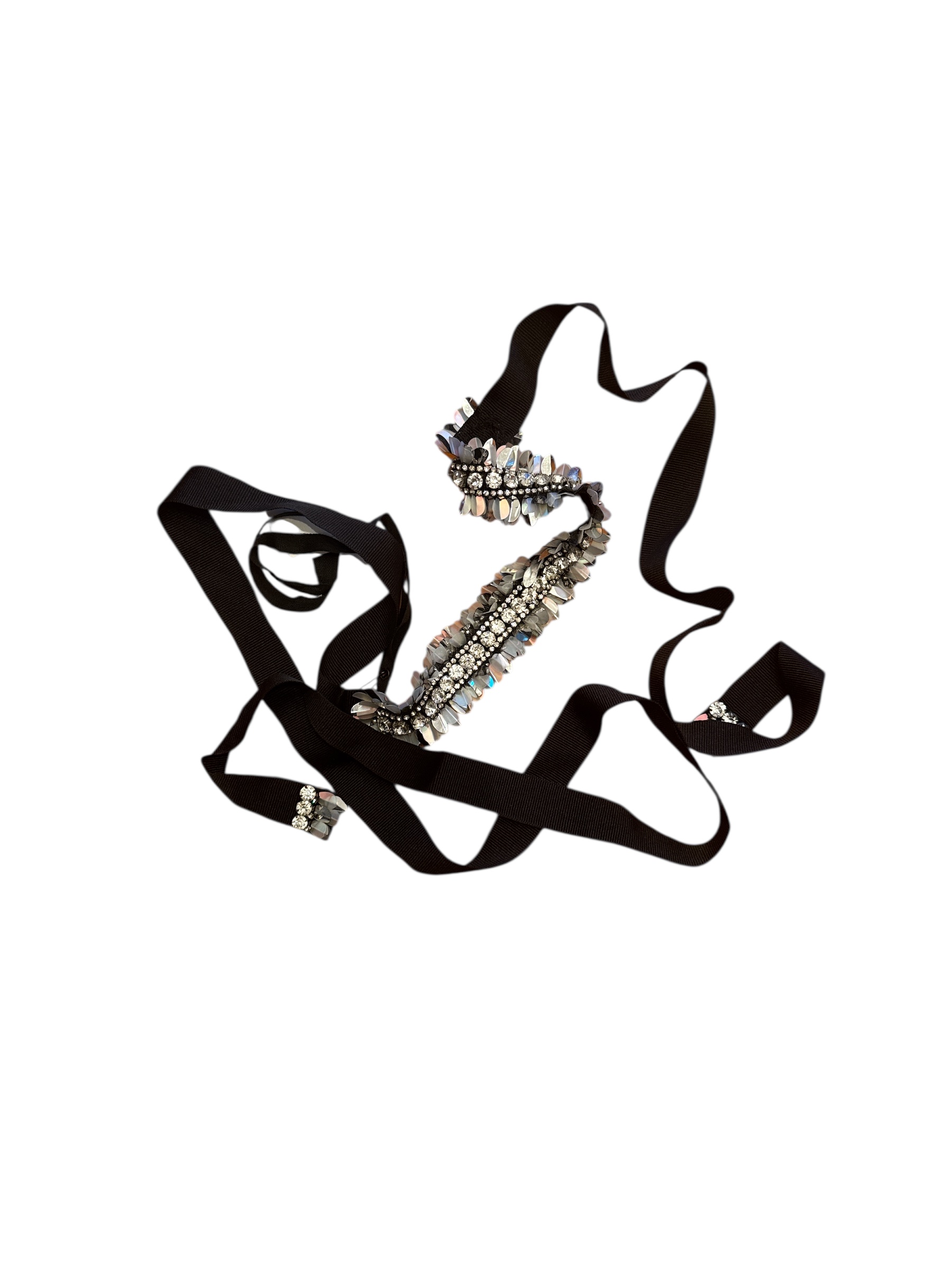Cintura gioiello composta da una fascia centrale decorata con cristalli e gemme sfaccettate nei toni dell’argento iridescente.
