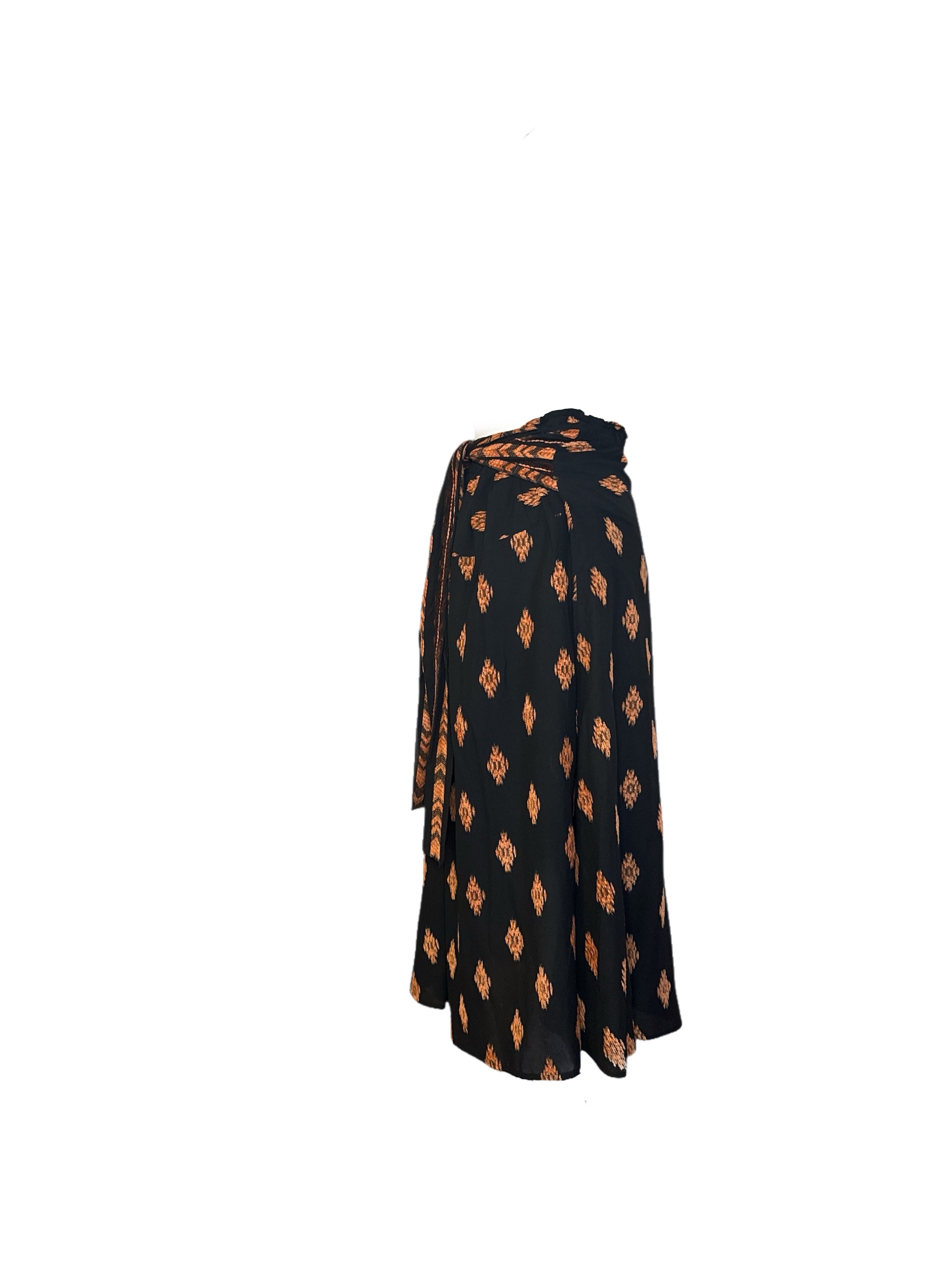 Gonna midi nera con stampa etnica geometrica in tonalità marrone bruciato.