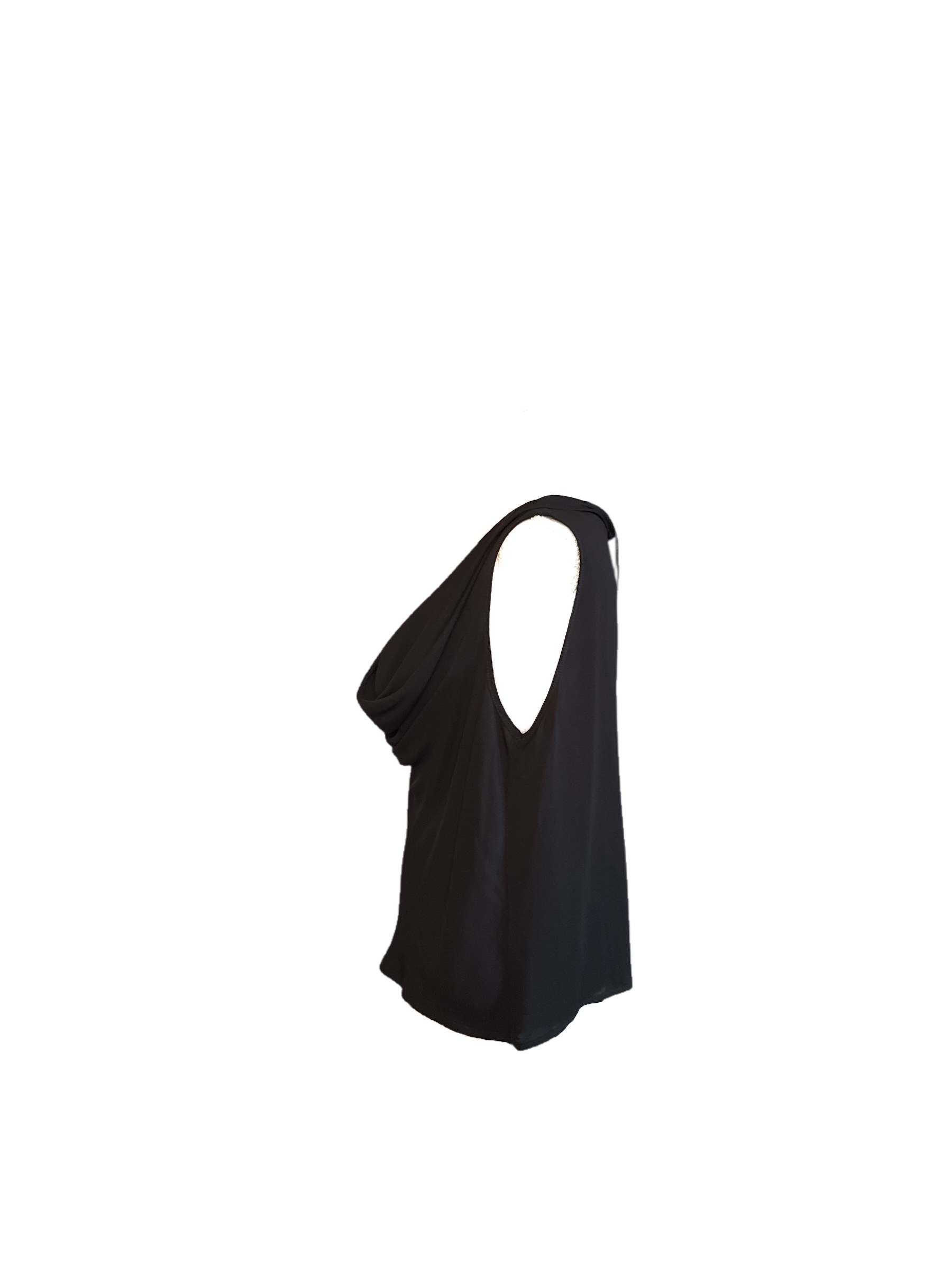 Top elegante nero smanicato caratterizzato da un elegante drappeggio a cascata sul davanti.