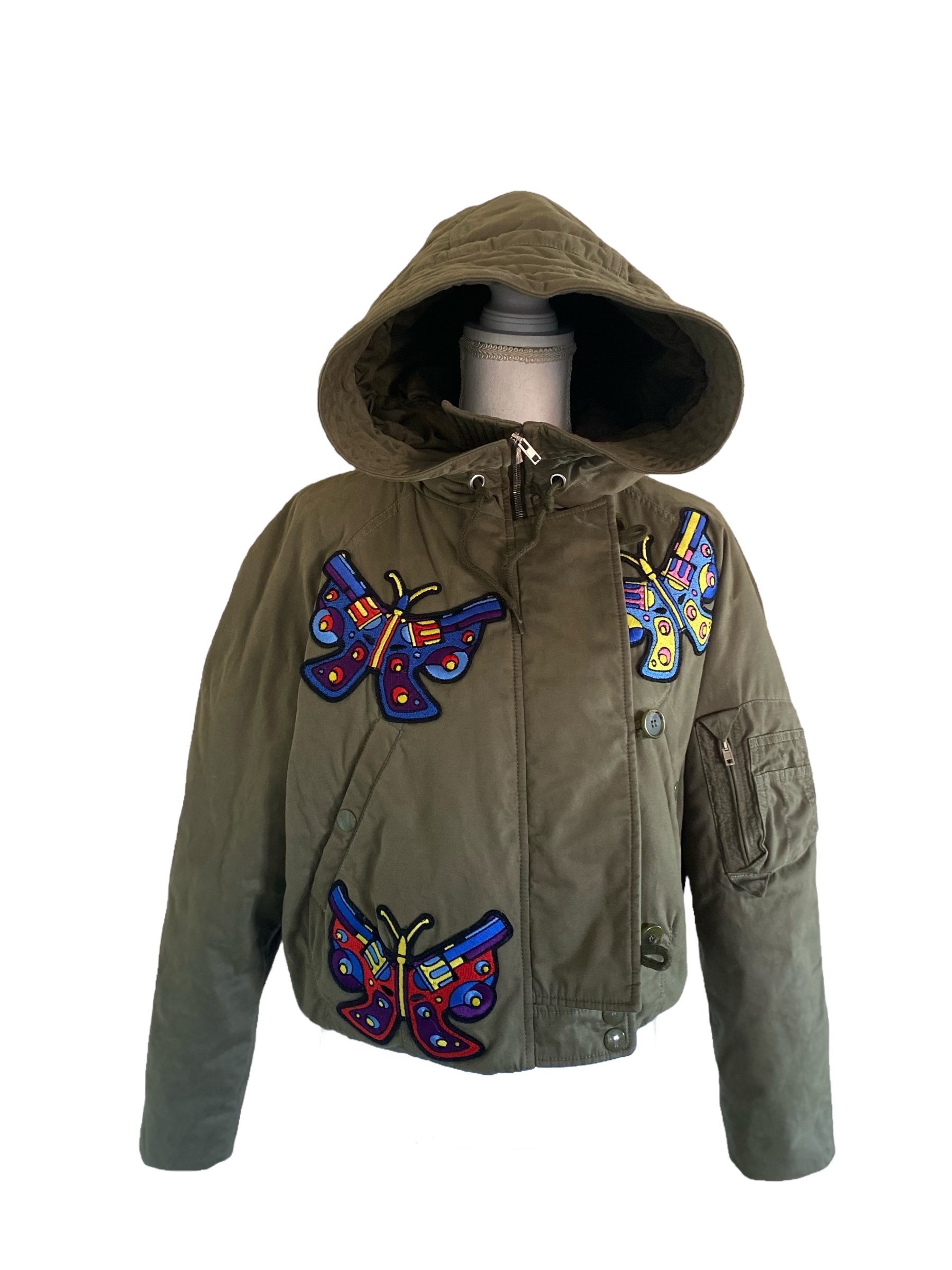 Giaccone verde militare con cappuccio e applicazioni di farfalle colorate.
