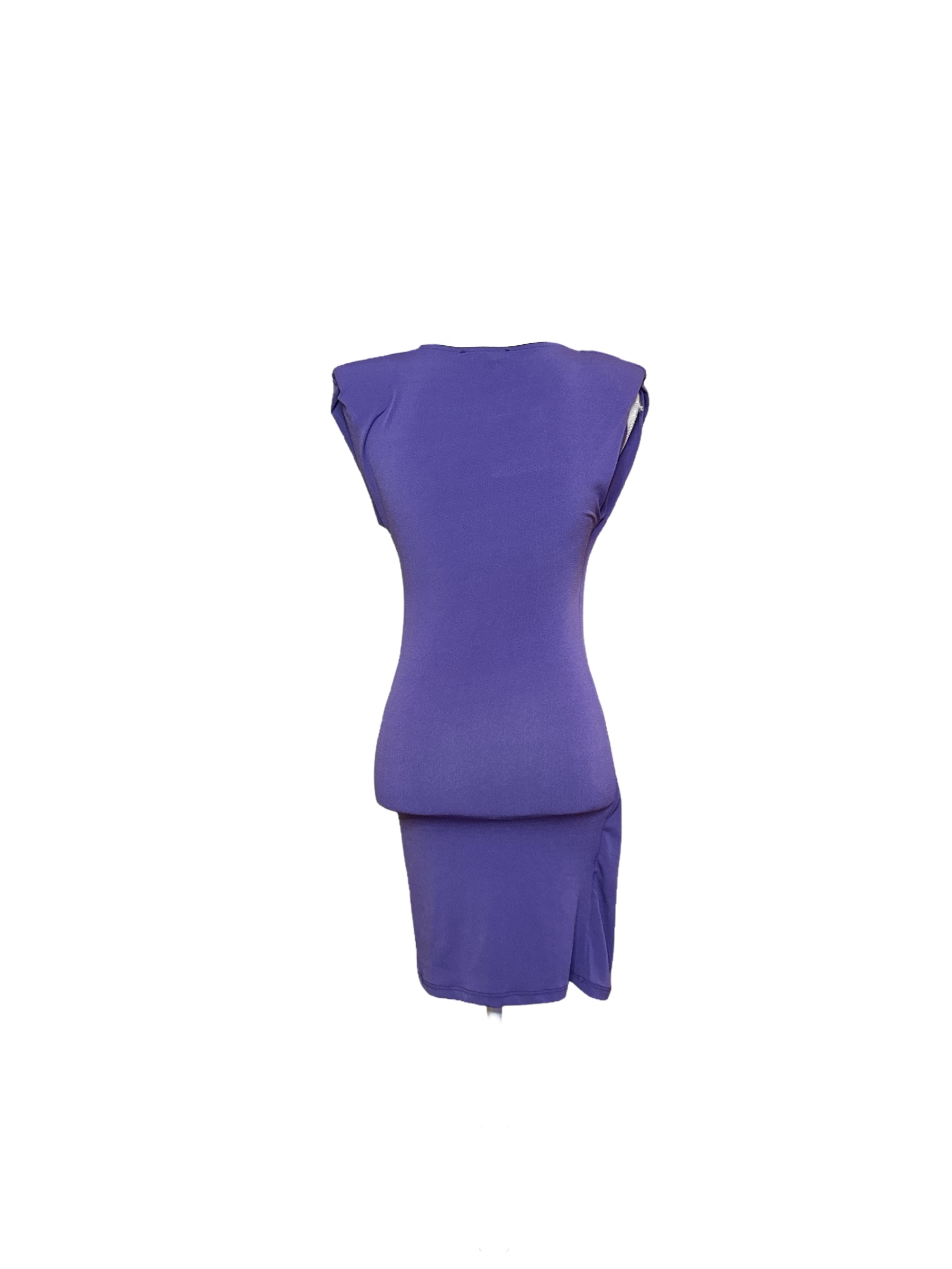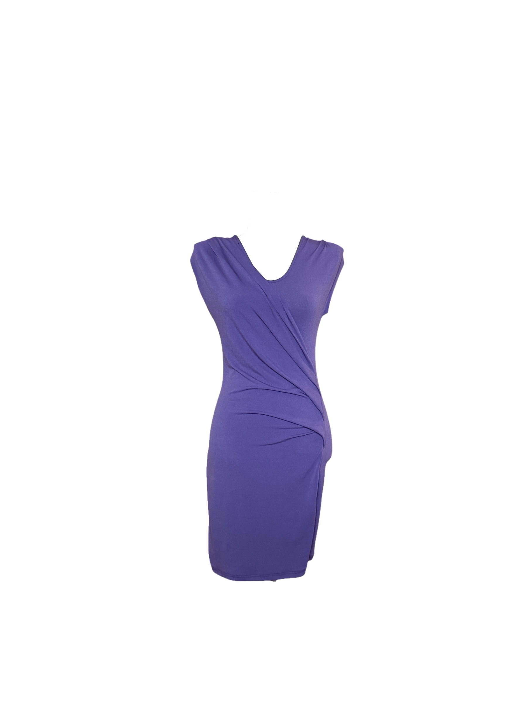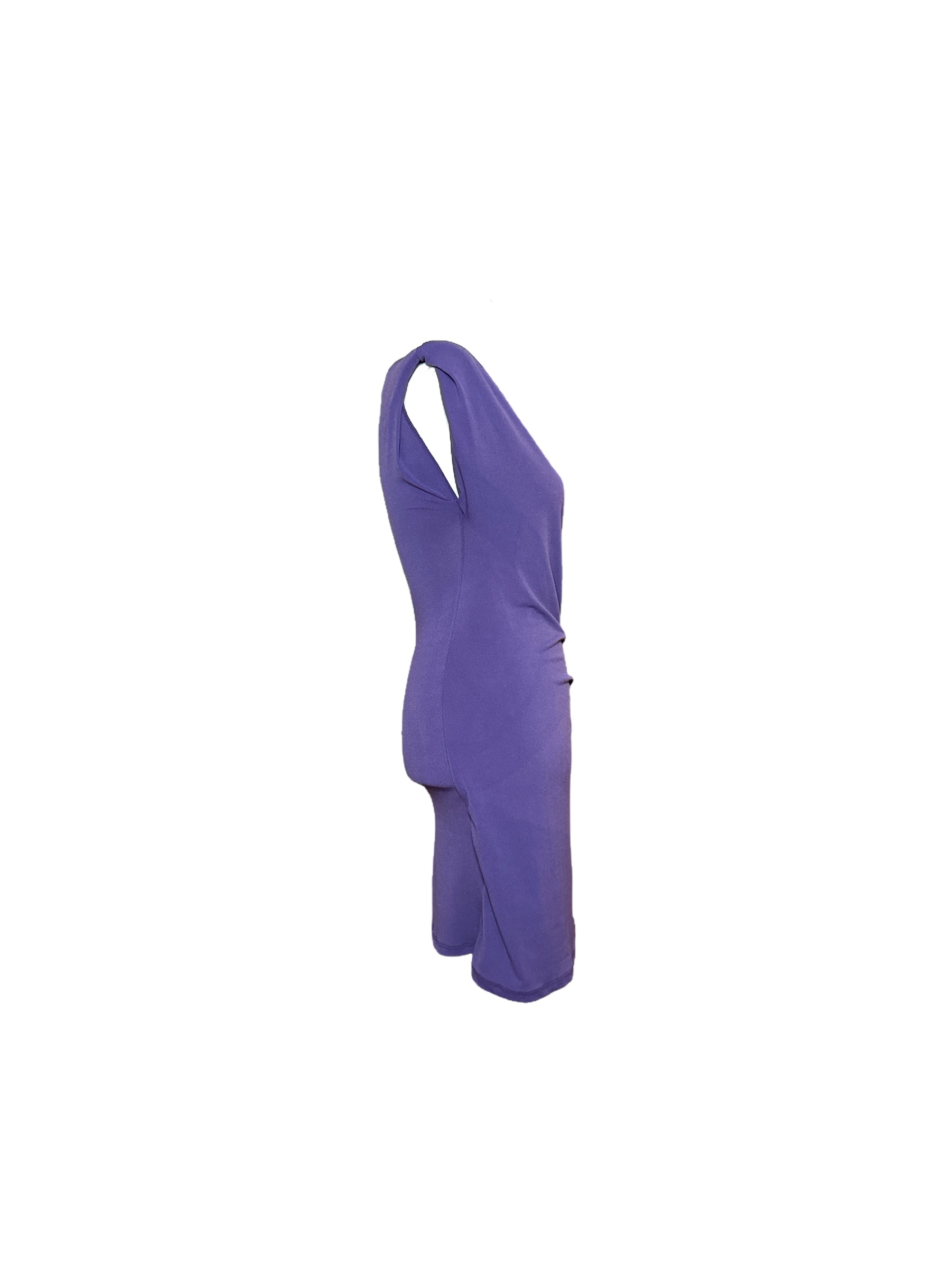 Scollo a V, senza maniche. Drappeggio laterale che crea un effetto incrociato.