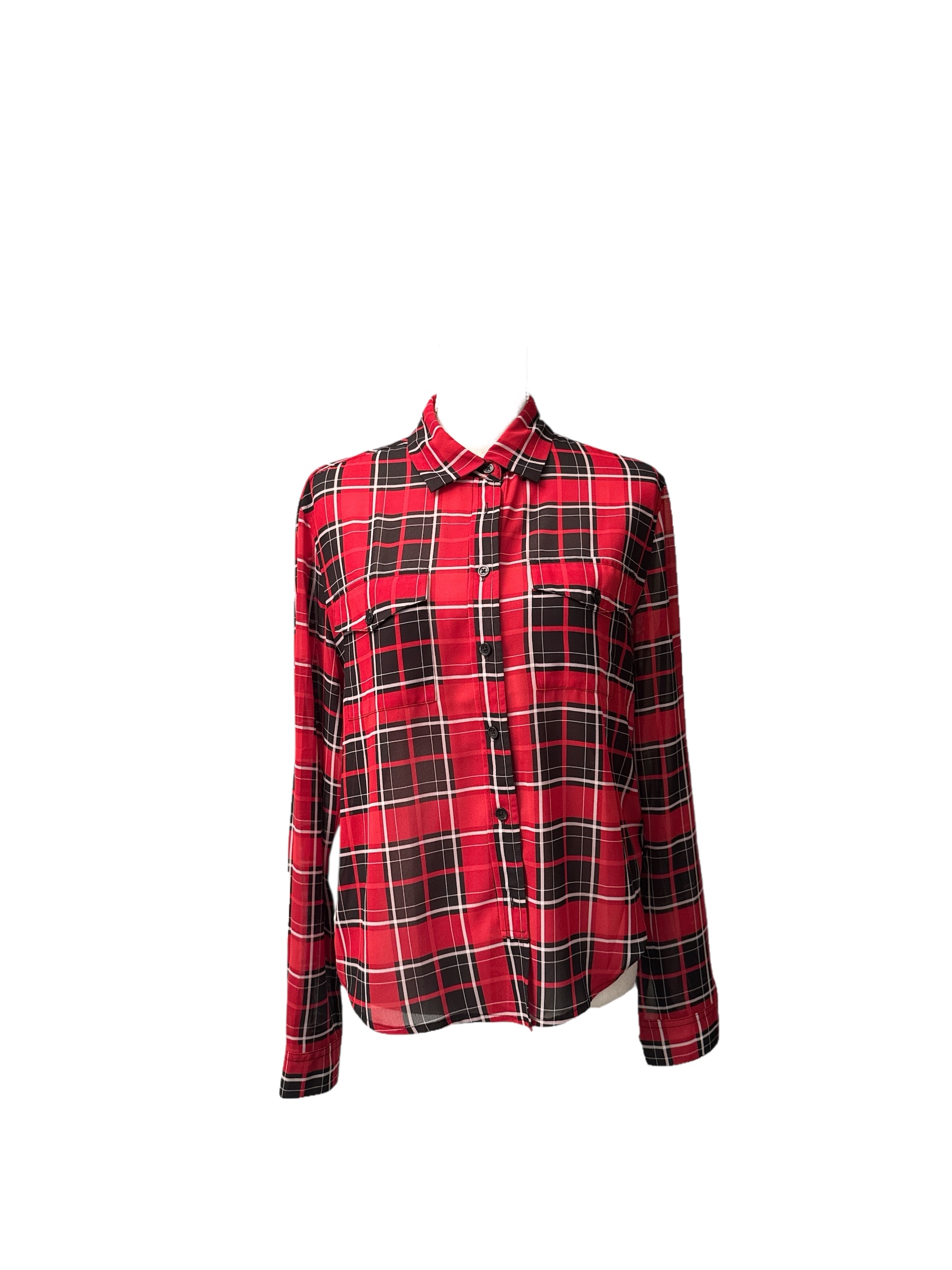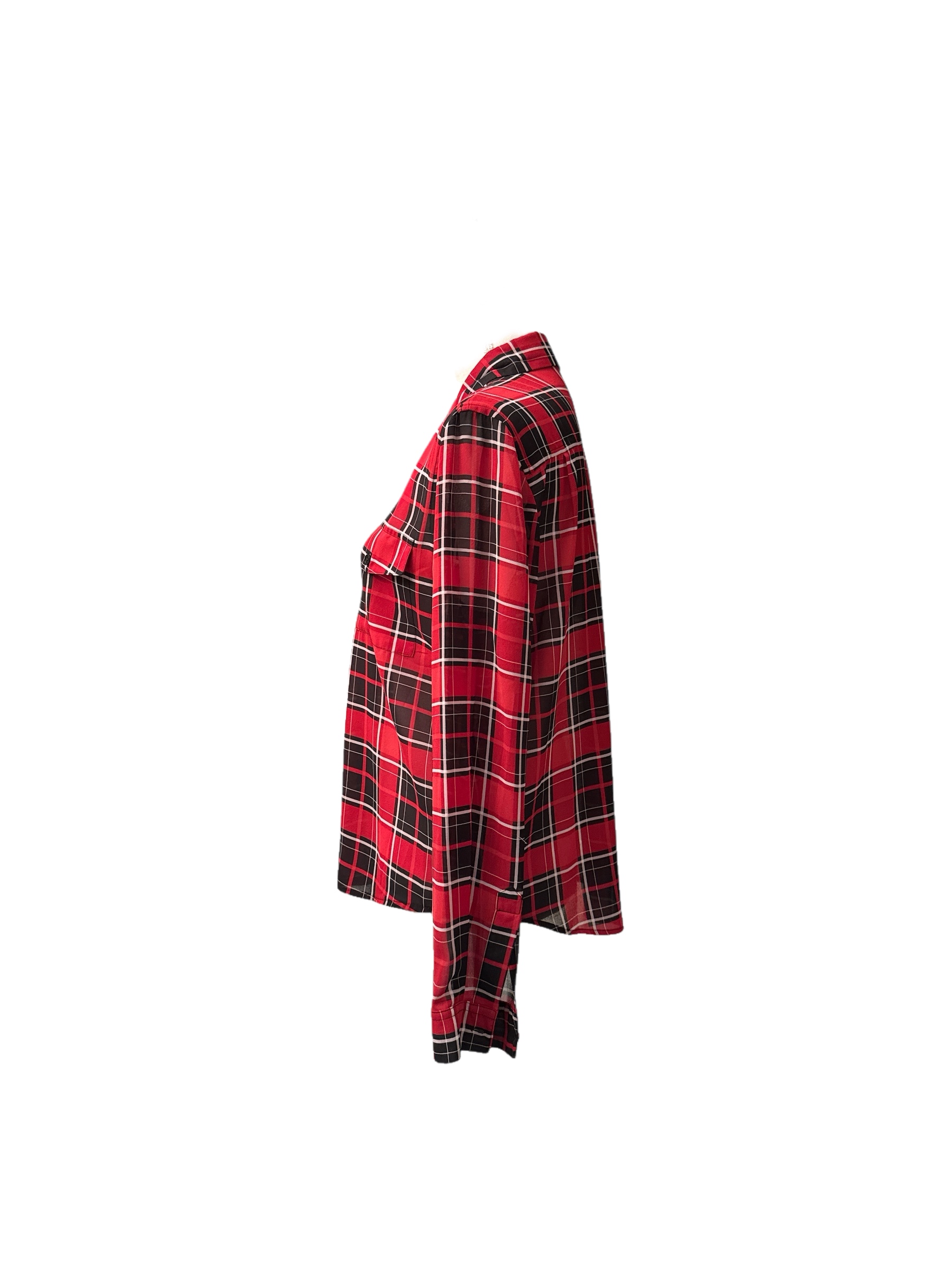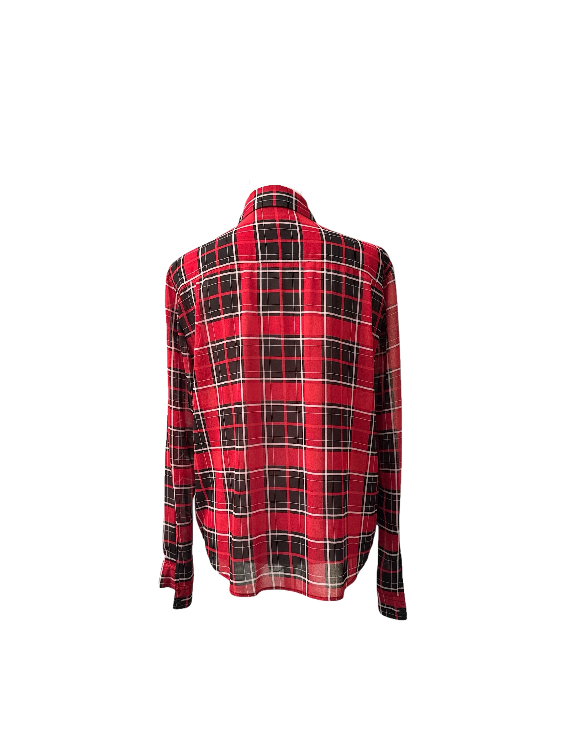 Camicia con classico motivo a quadri, con colori predominanti rosso vivo e nero.