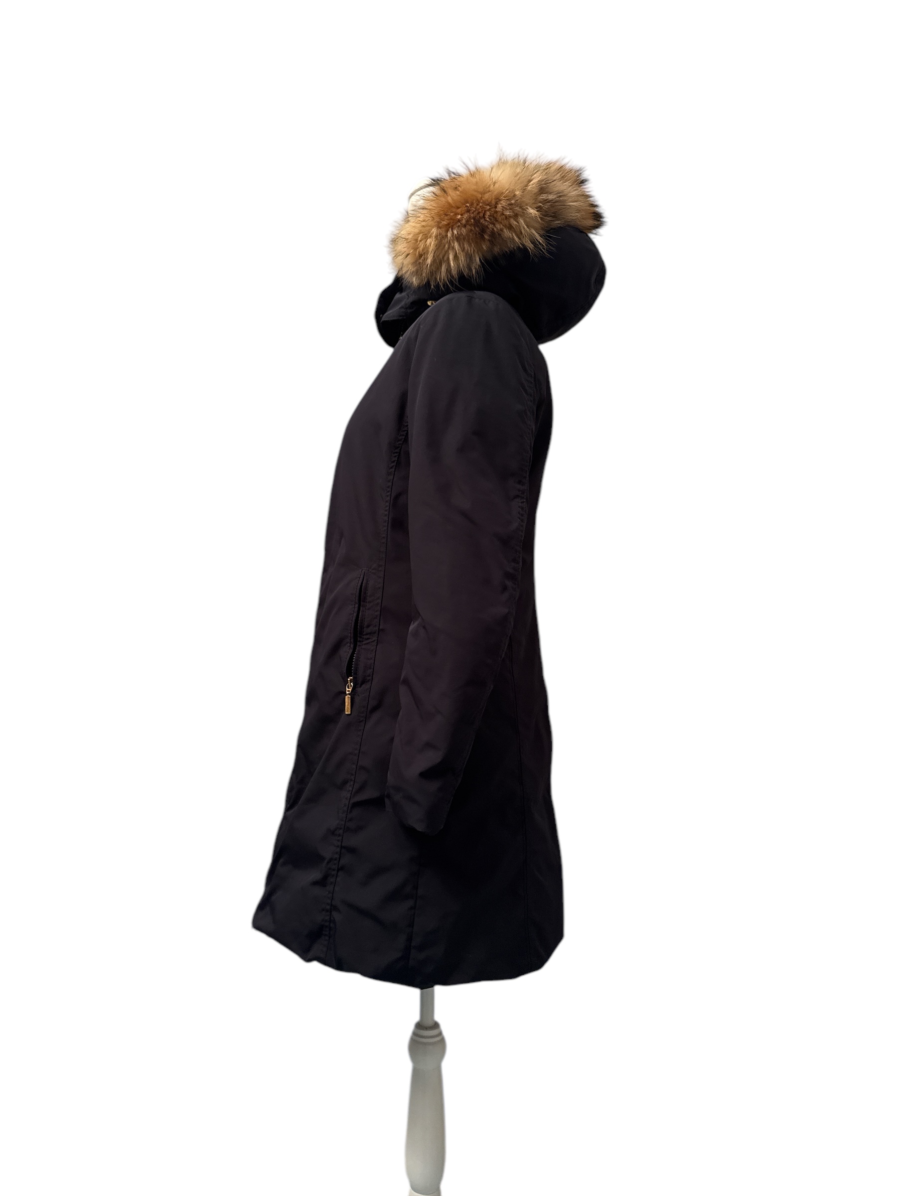 Parka blu scuro imbottito con cappuccio bordato da pelliccia staccabile.