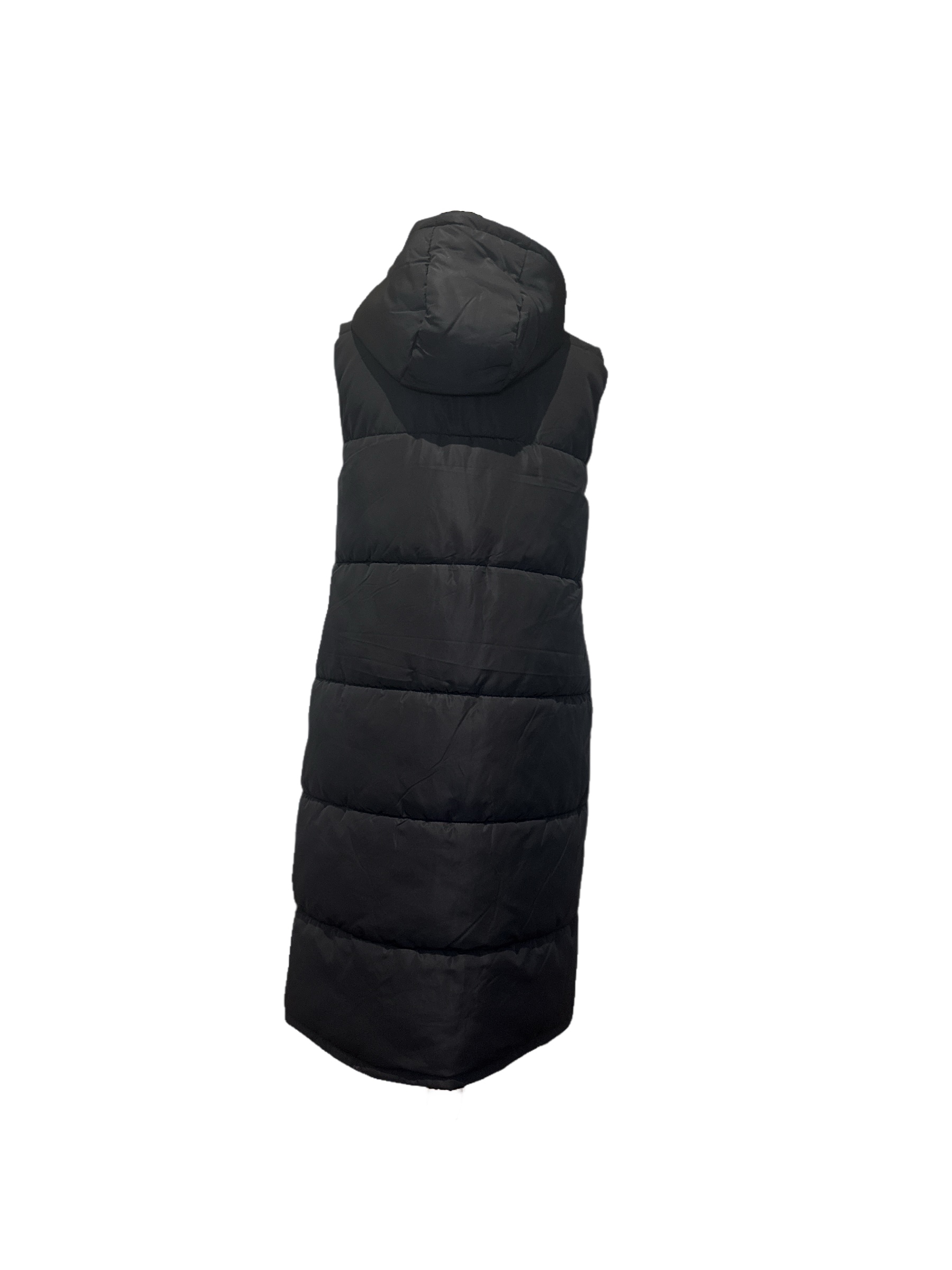 Gilet lungo imbottito di colore nero con zip frontale a tutta lunghezza.