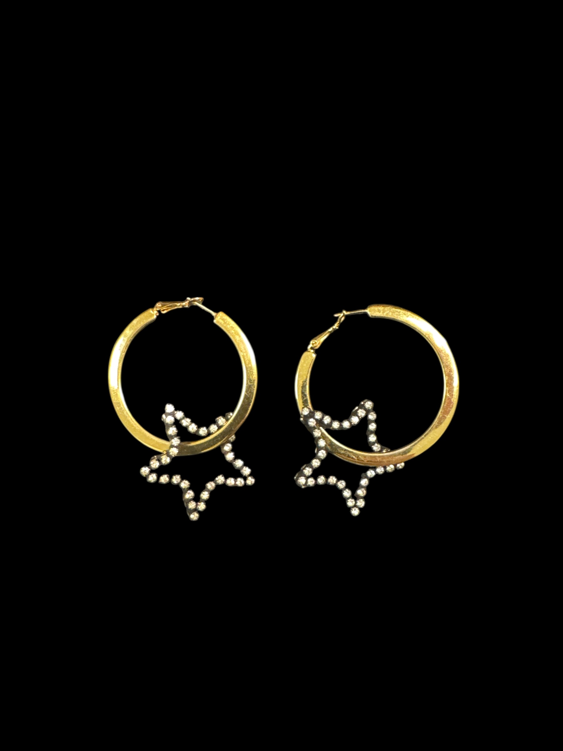 Orecchini a cerchio dorati con pendente a forma di stella, formata da piccoli strass bianchi che aggiungono brillantezza.