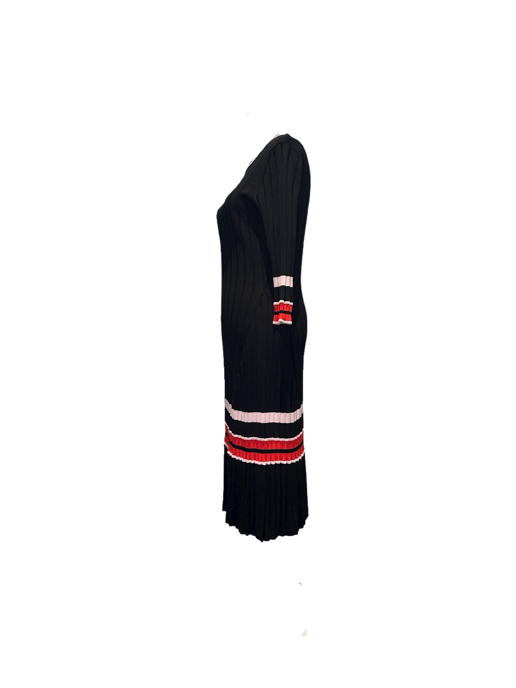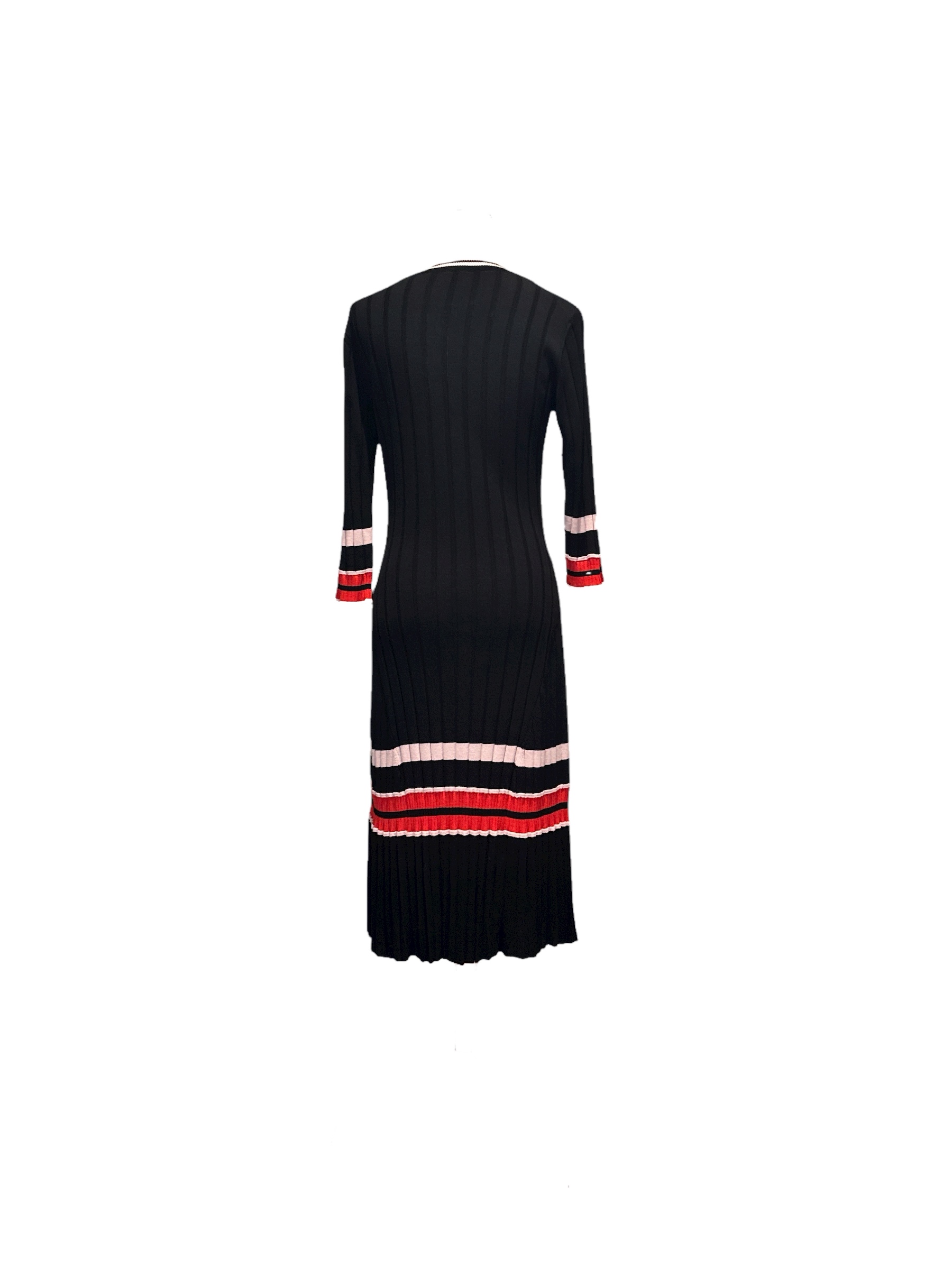 Abito midi a maniche lunghe. Colore principale nero, con bande orizzontali rosa e rosse.
