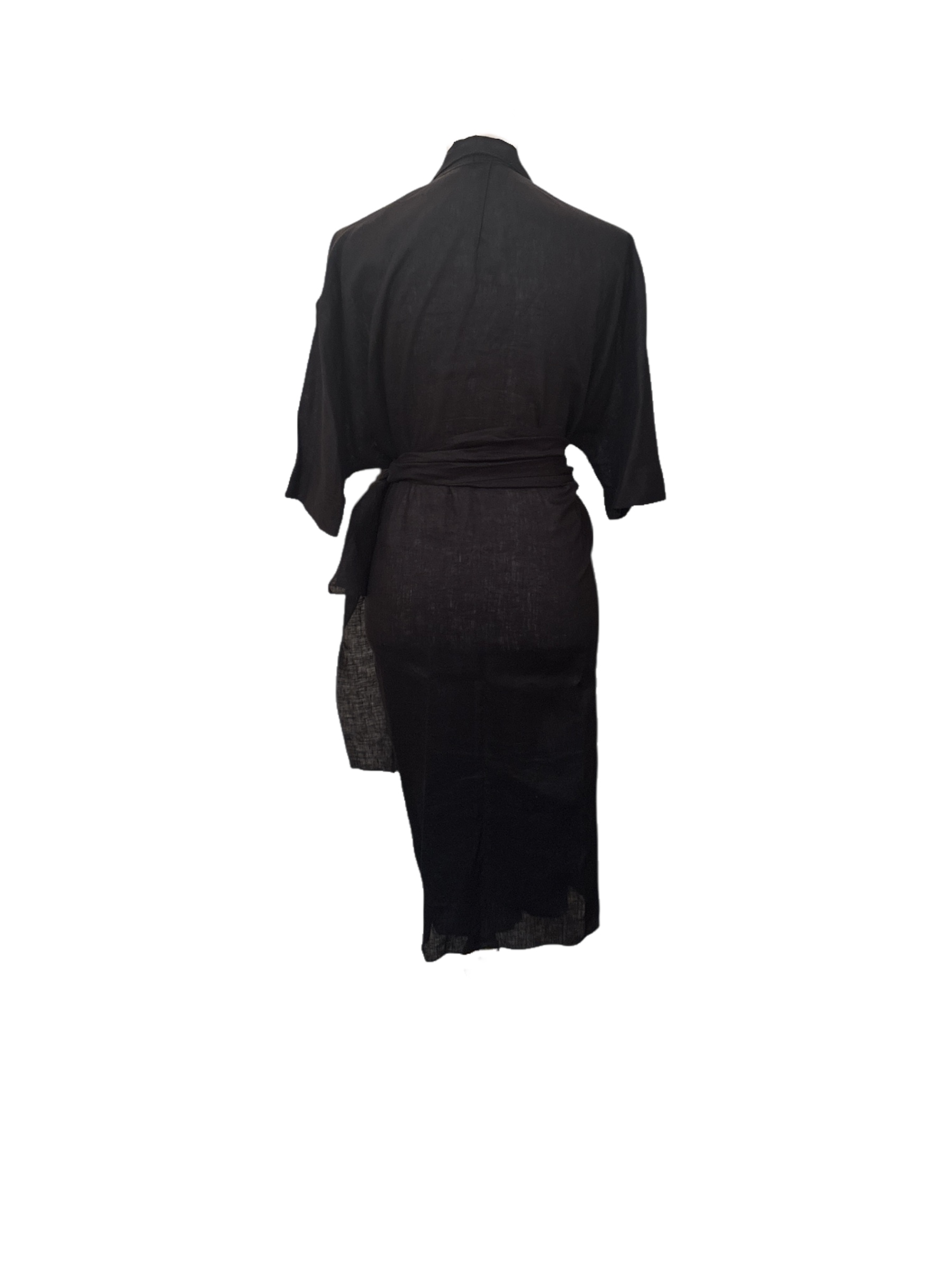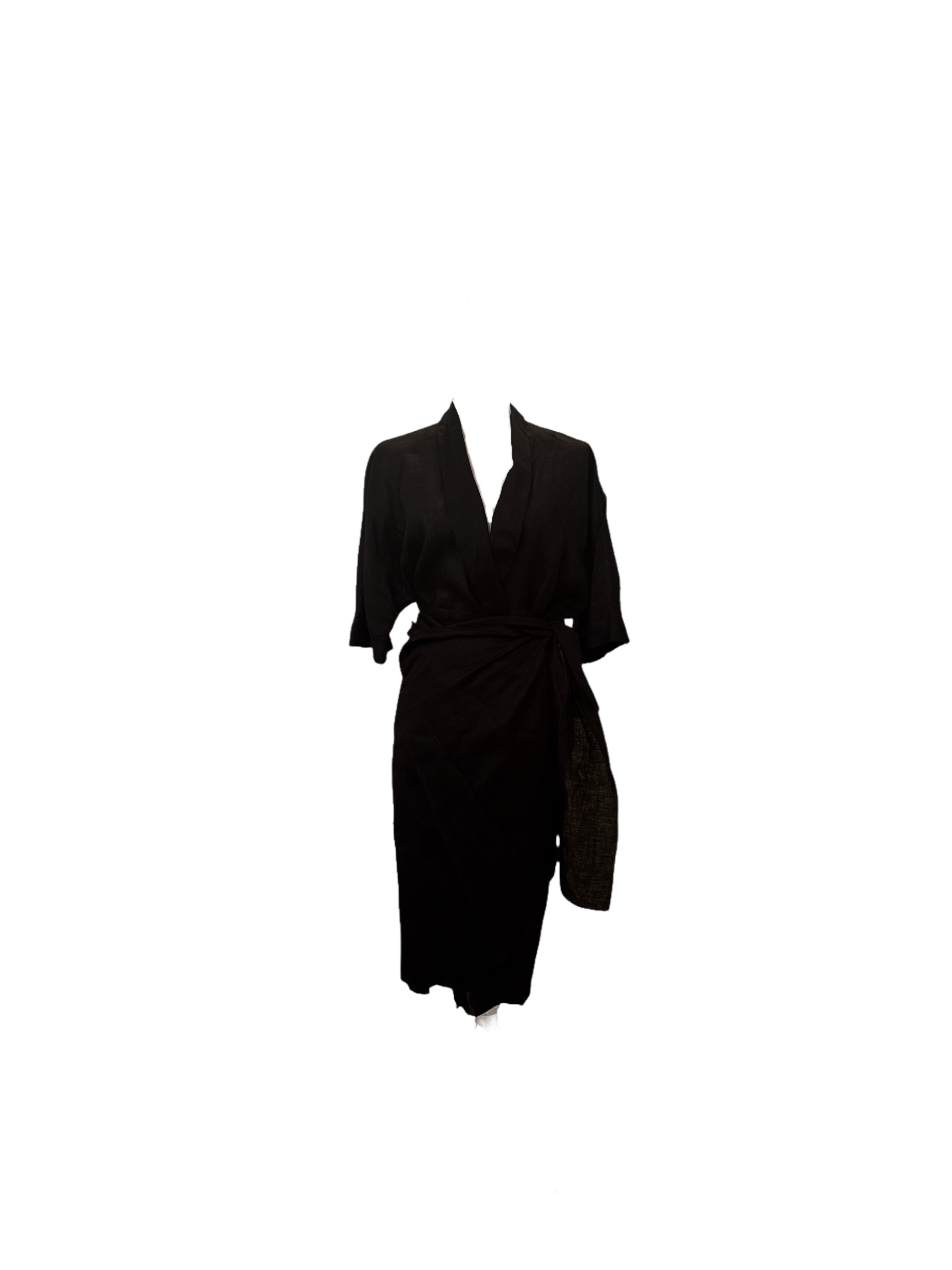 Abito a portafoglio nero in lino con maniche a 3/4.