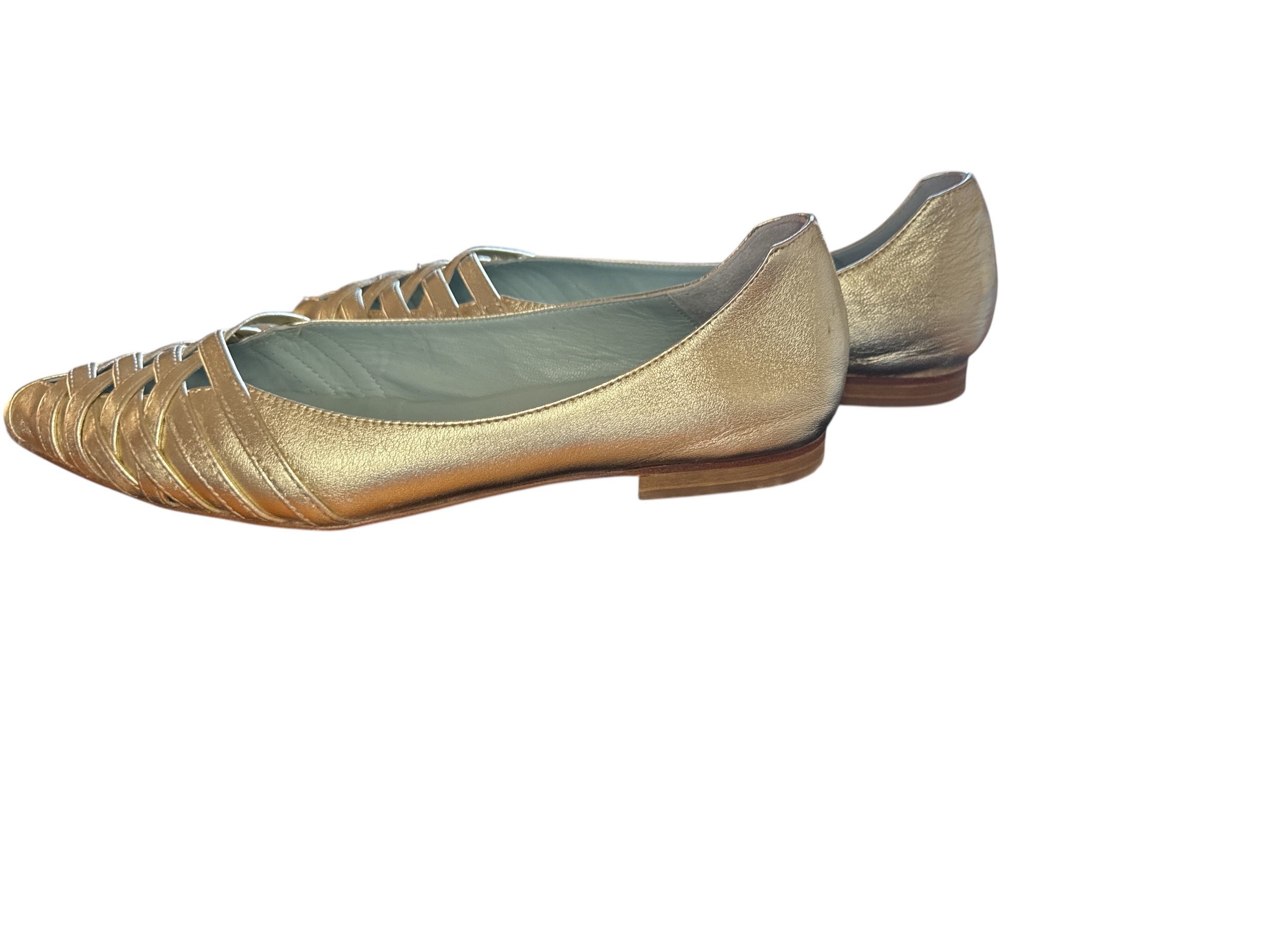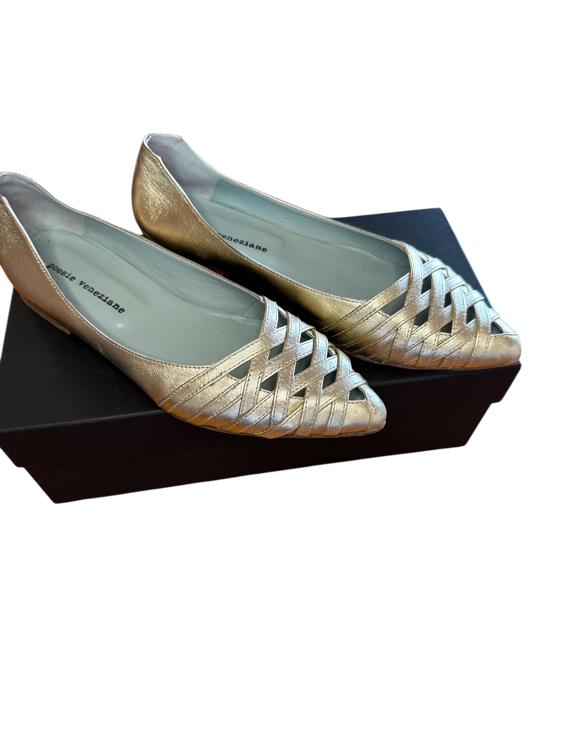 Ballerine color oro metallizzato con punta chiusa e lavorazione intrecciata sul davanti.