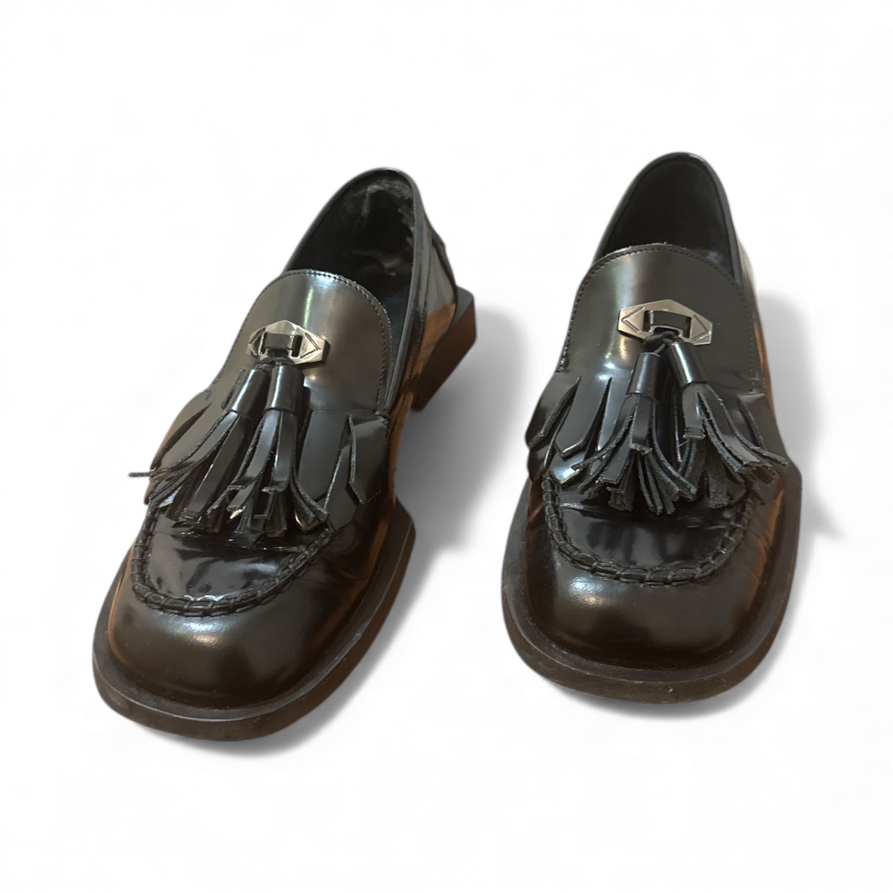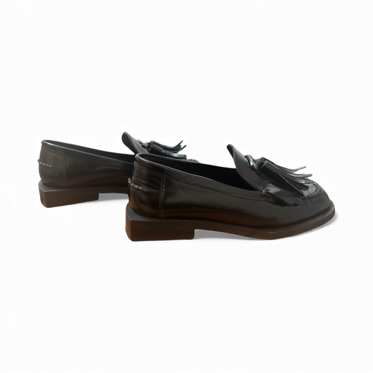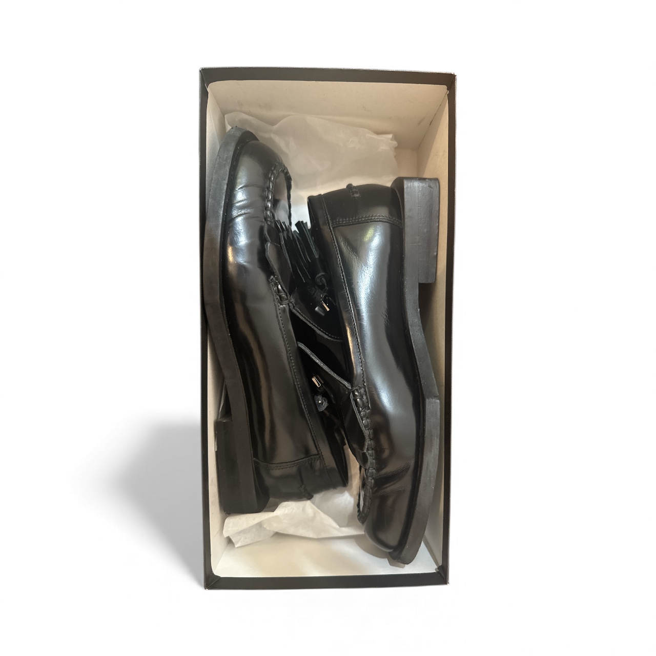Mocassini neri con nappine decorativi. Punta arrotondata e cuciture a vista.