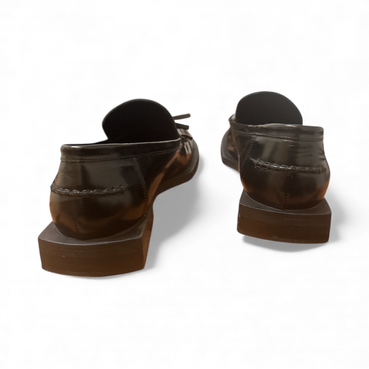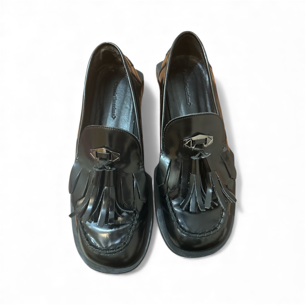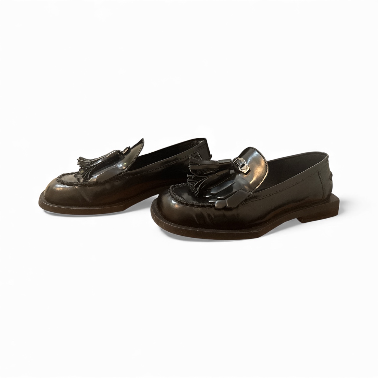 Mocassini neri con nappine decorativi. Punta arrotondata e cuciture a vista.