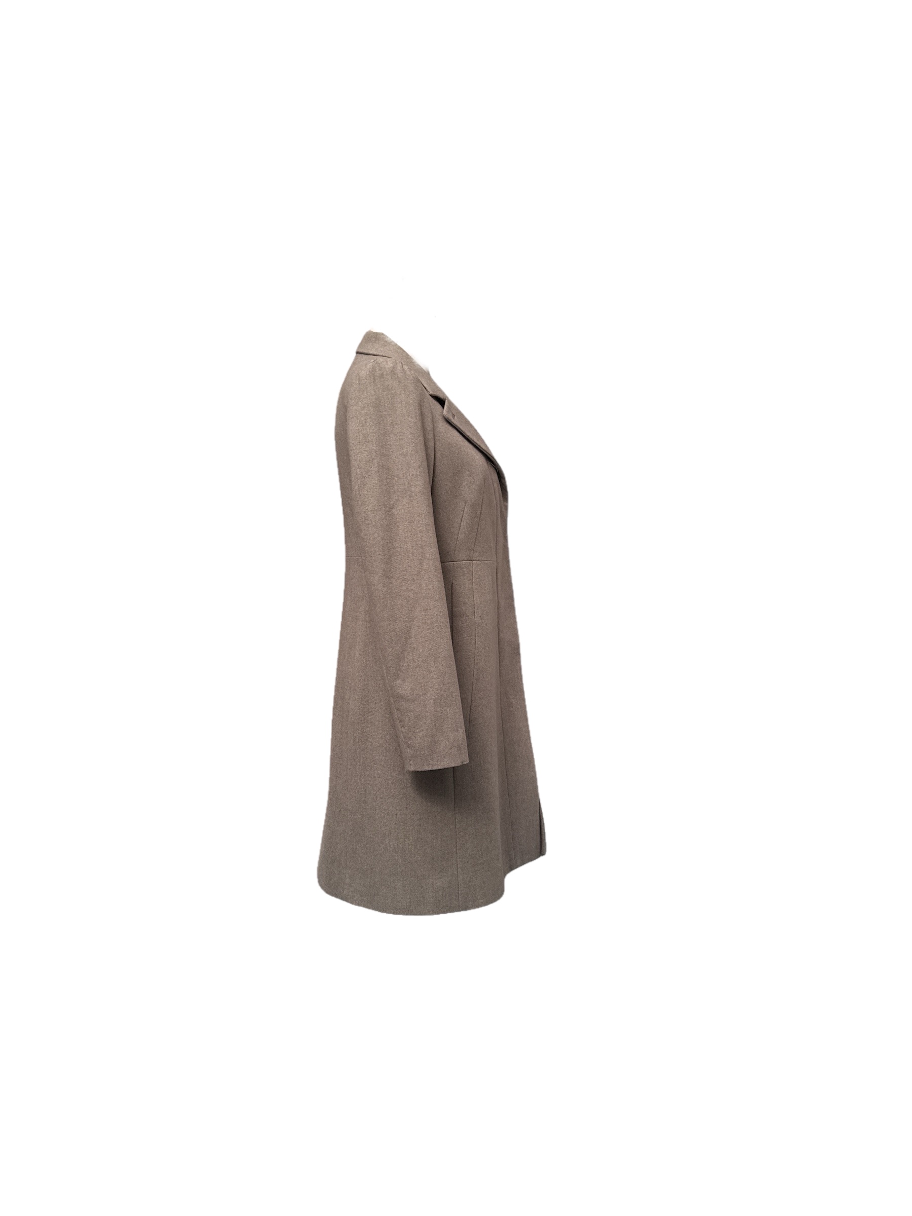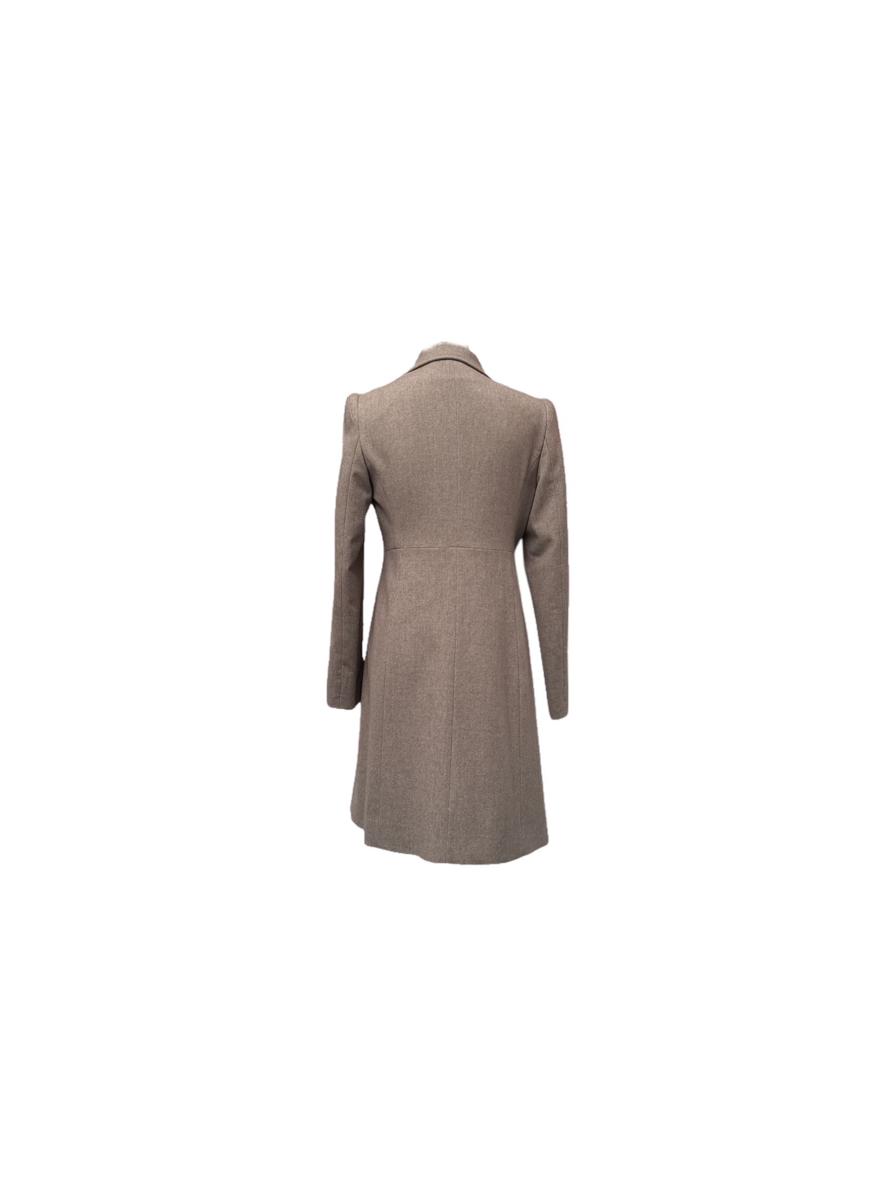 Cappotto grigio con collo revers e chiusura con bottoni nascosti.