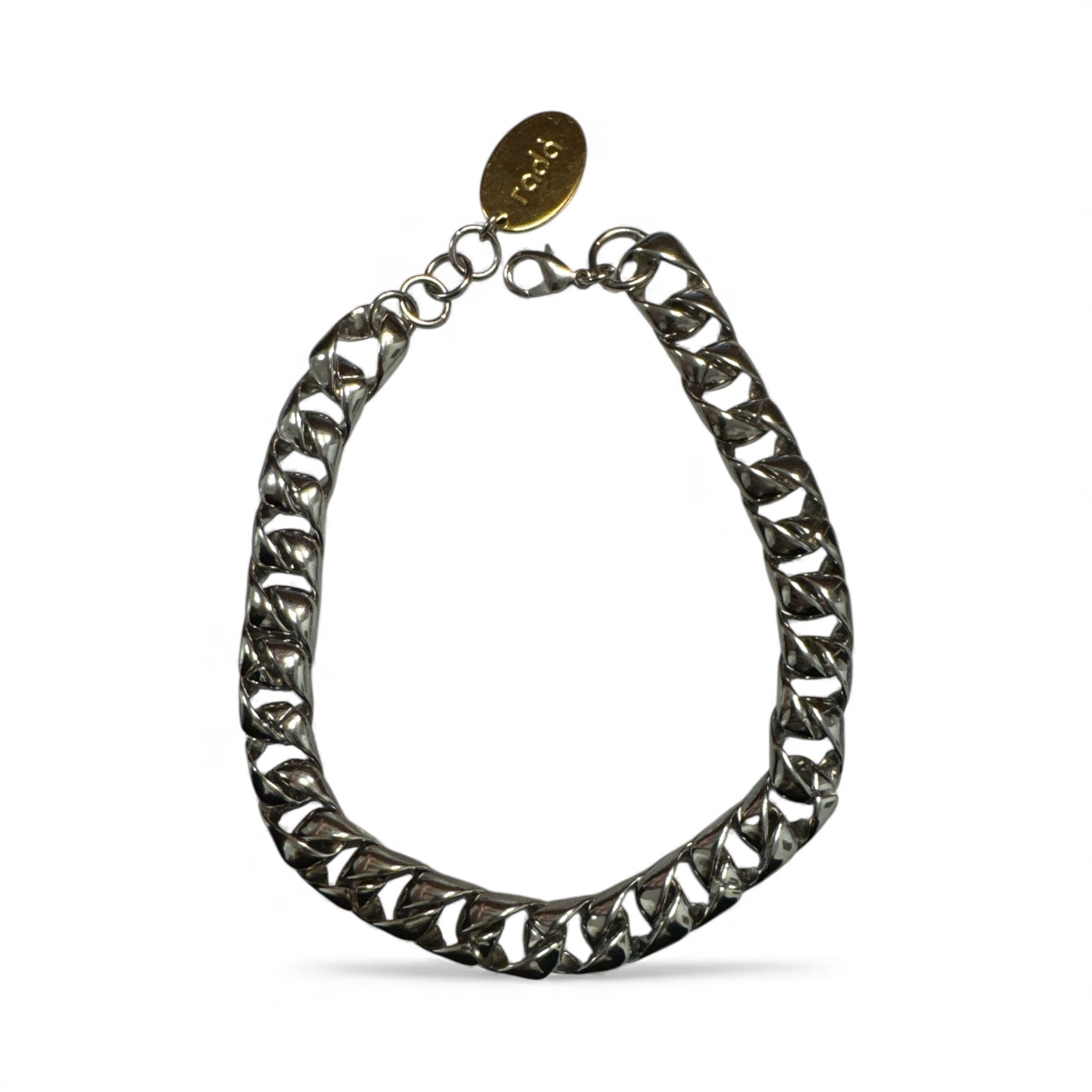 Collana a girocollo composta da maglie piatte e larghe in metallo argentato con effetto lucido e riflettente.