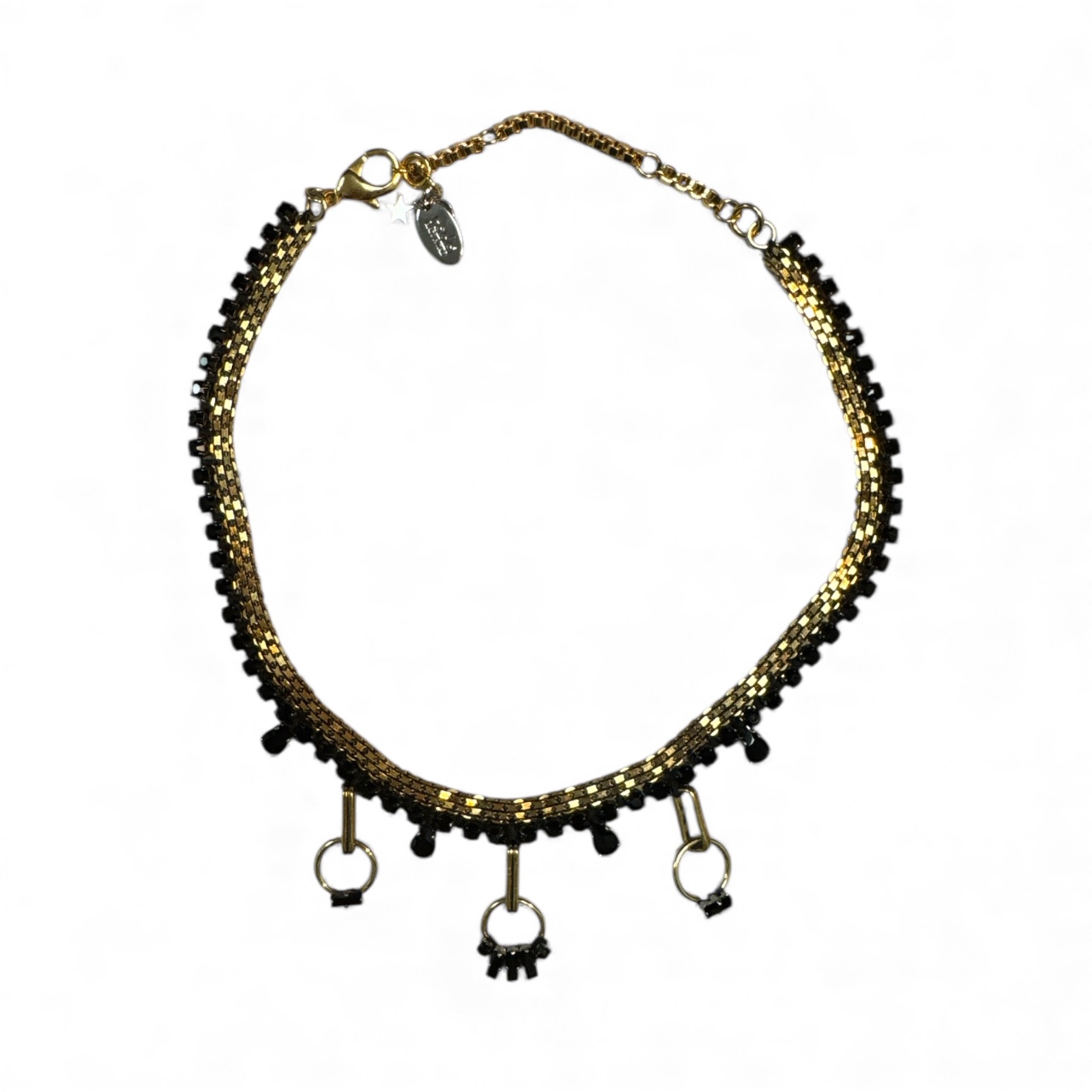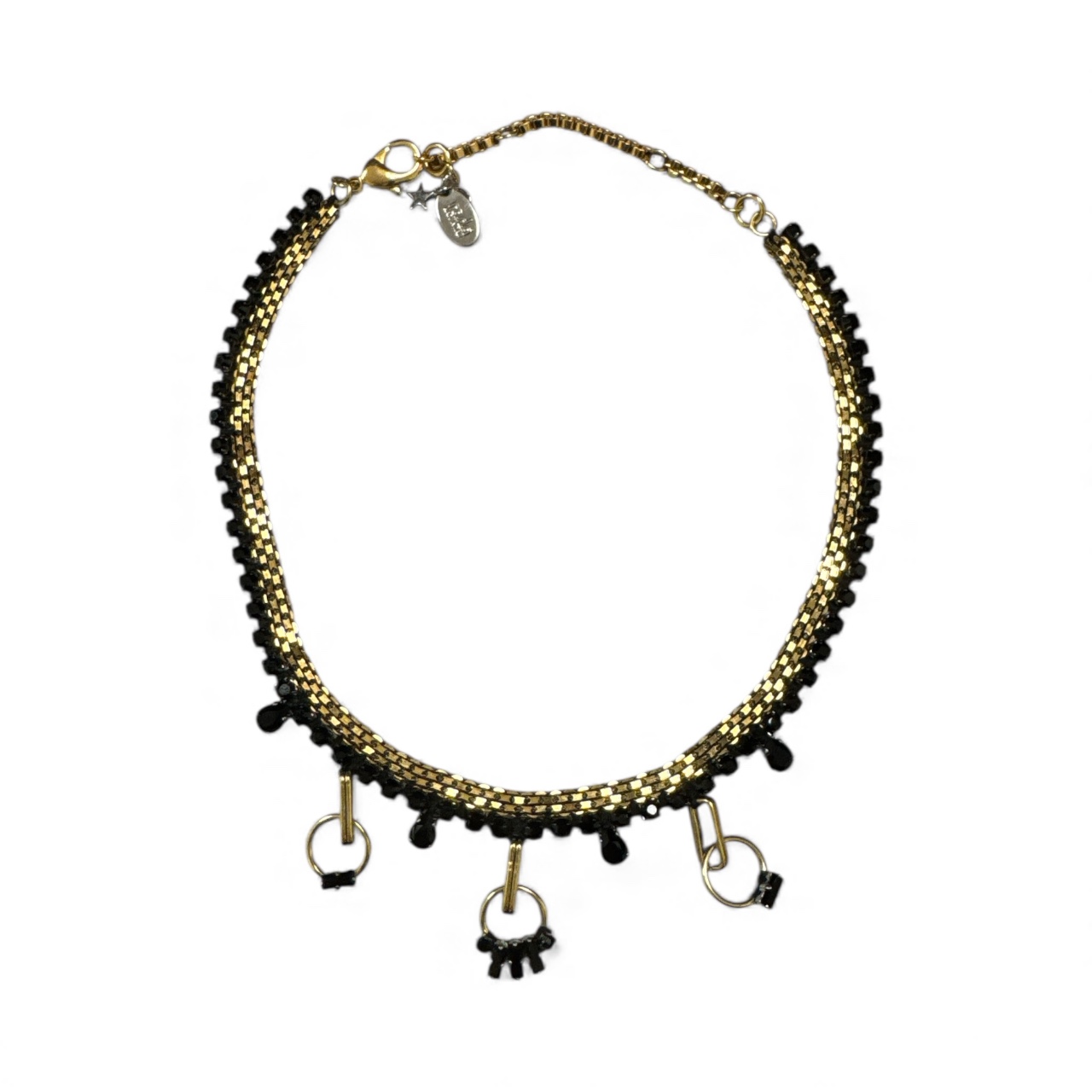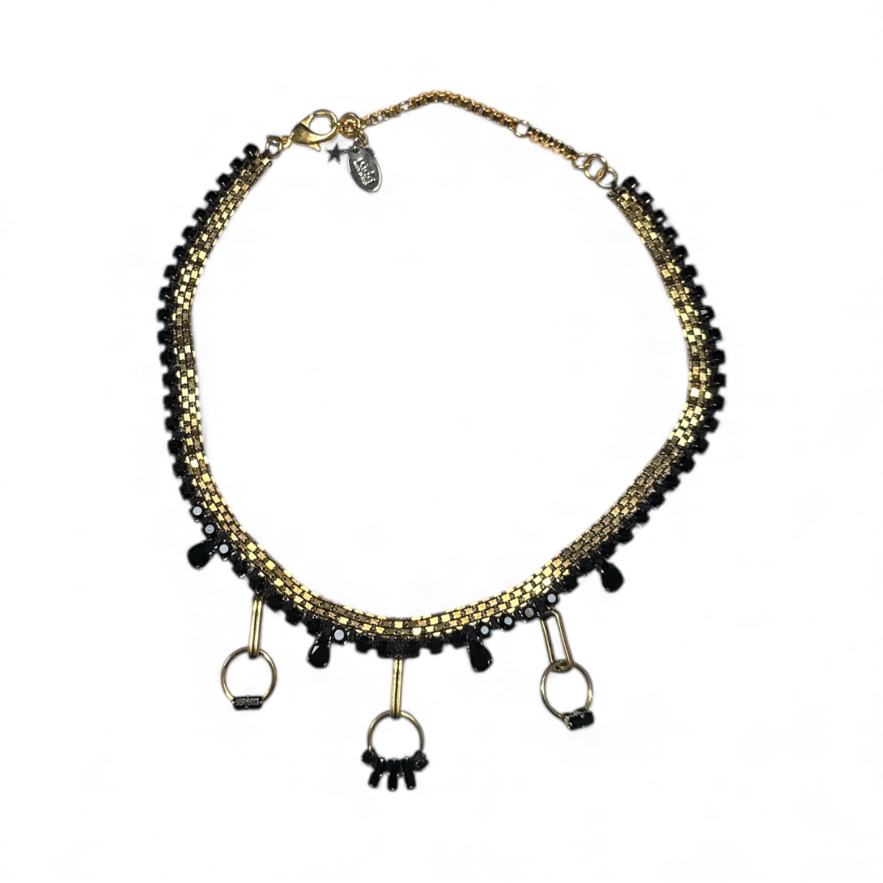 Collana girocollo composta da fascia intrecciata composta da piccole maglie dorate alternate da bordatura nera di pietre che creano un contrasto molto deciso.