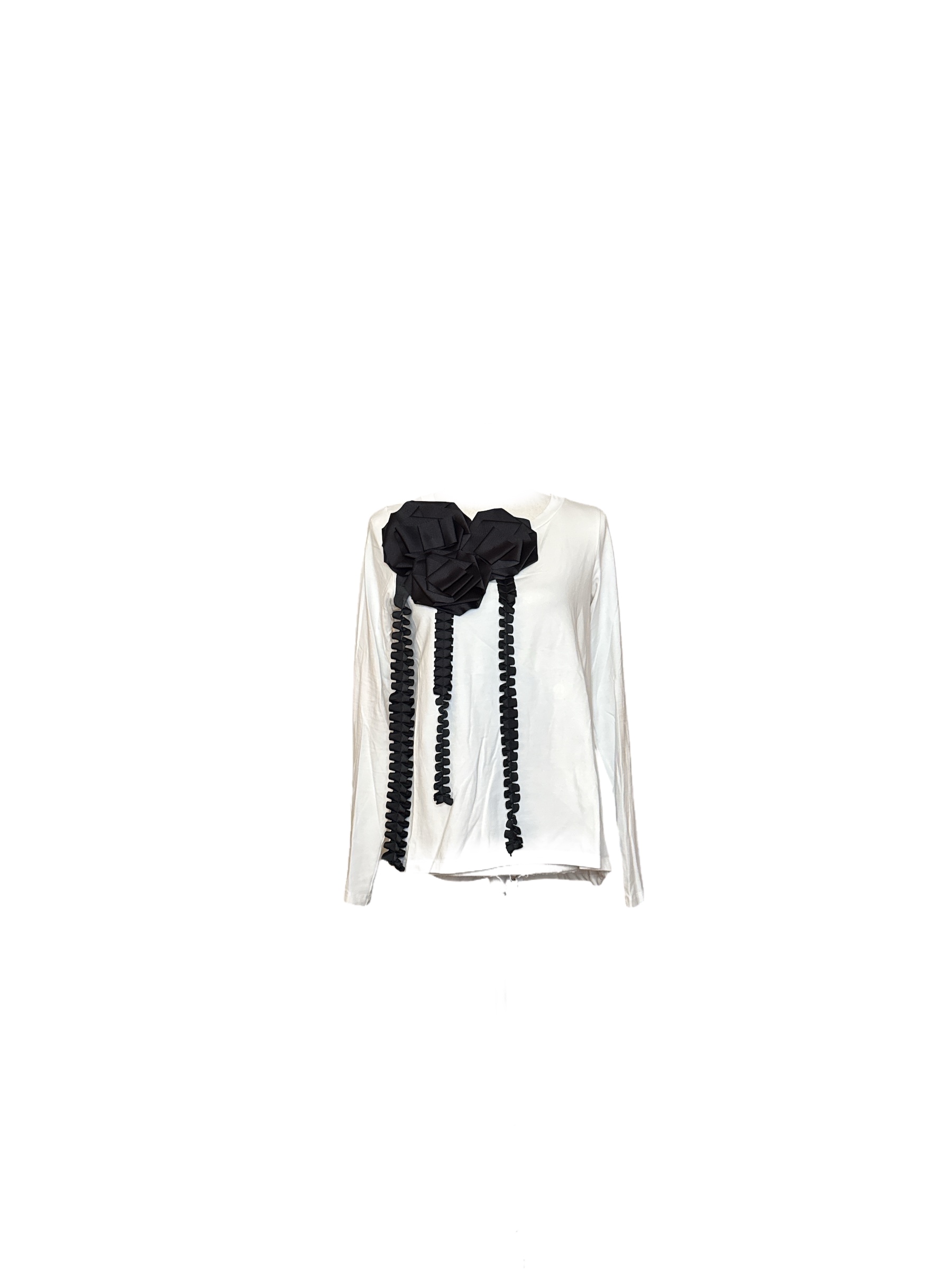 Sul lato sinistro 2 grandi fiori tridimensionali di tessuto nero accompagnati da nastri e elementi arricciati dello stesso colore.