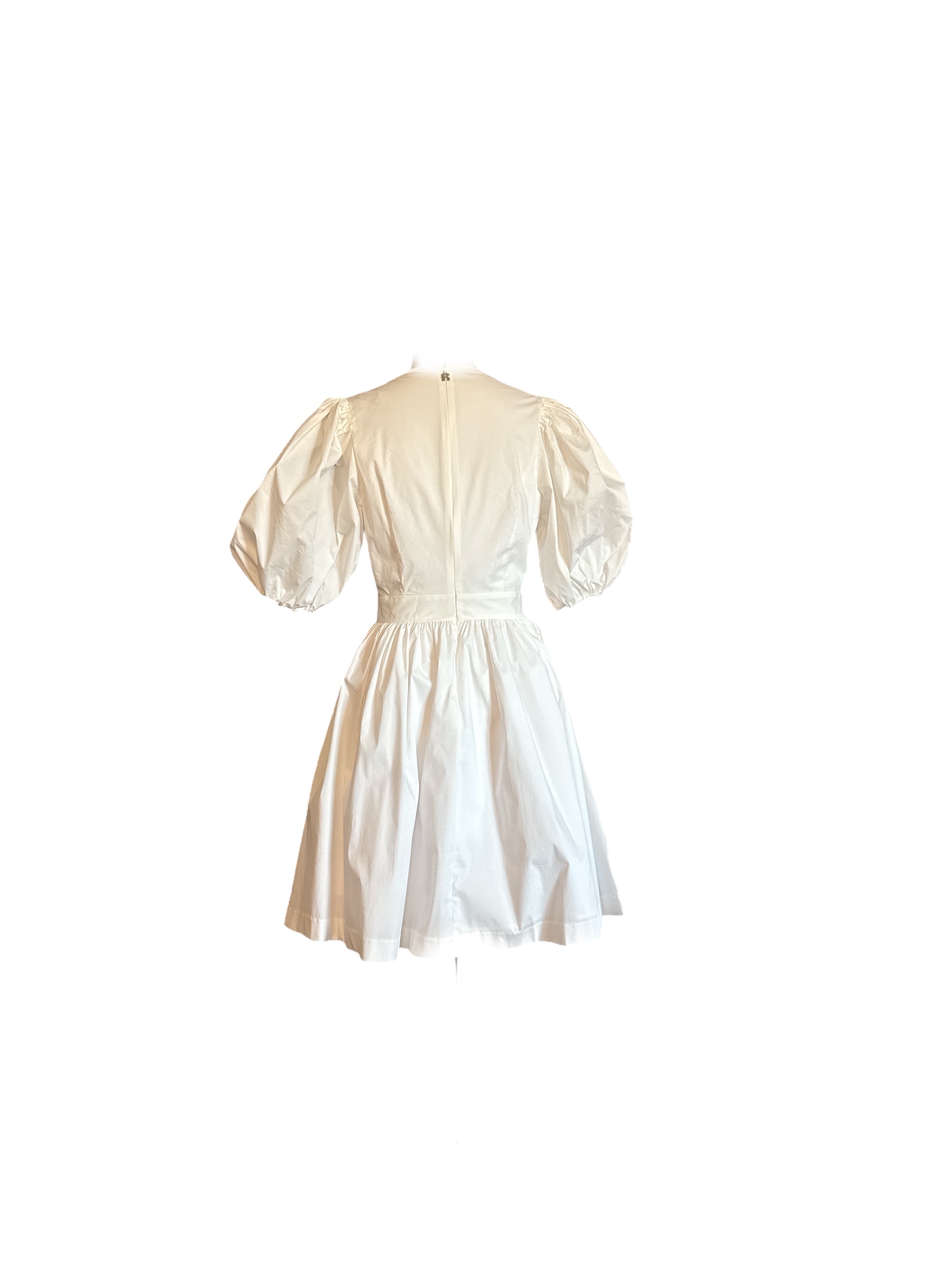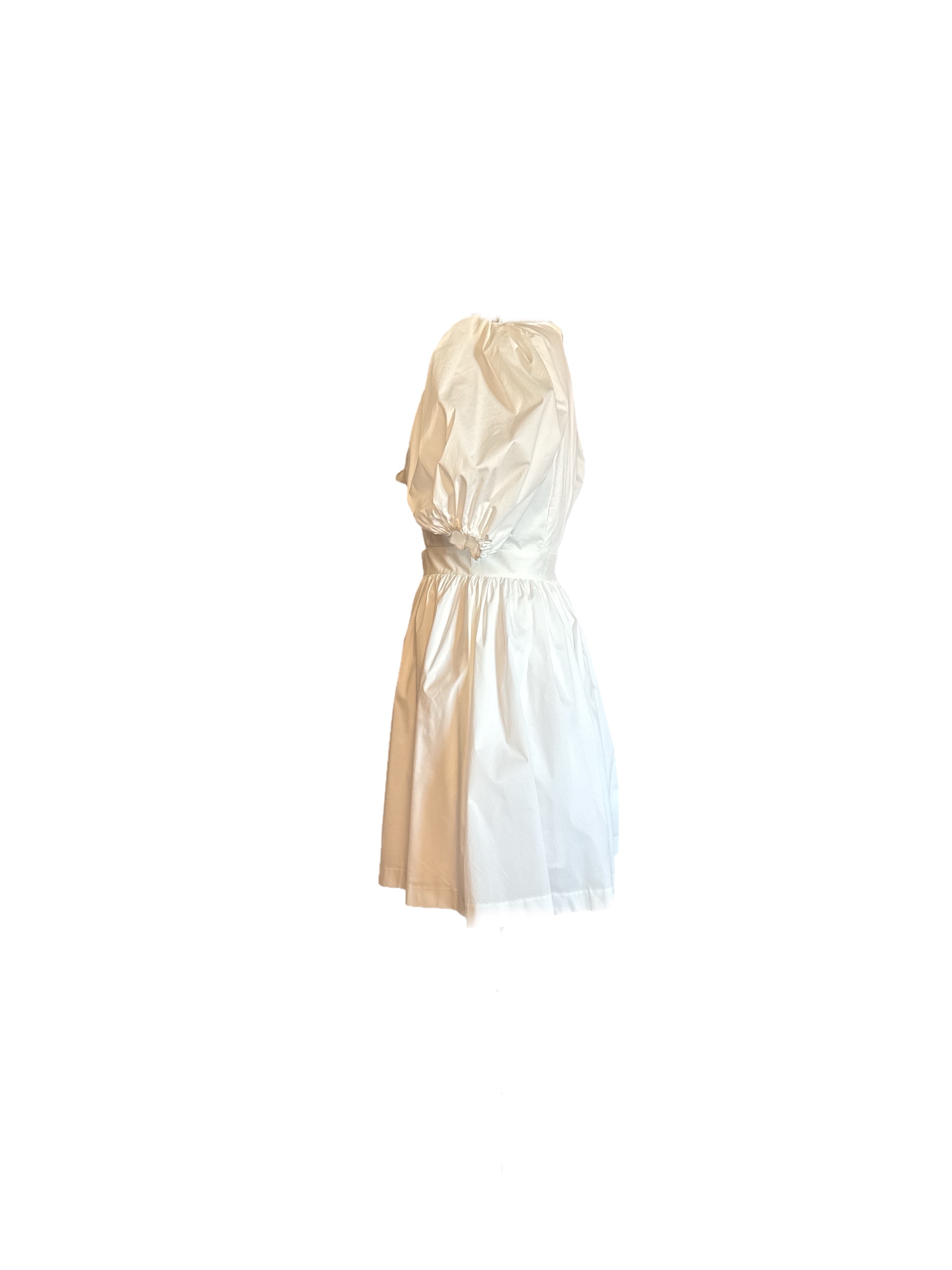 Abito corto bianco lunghezza mini con ampia gonna arricciata, corpetto aderente, scollatura a V e dettaglio fiocco sul davanti.