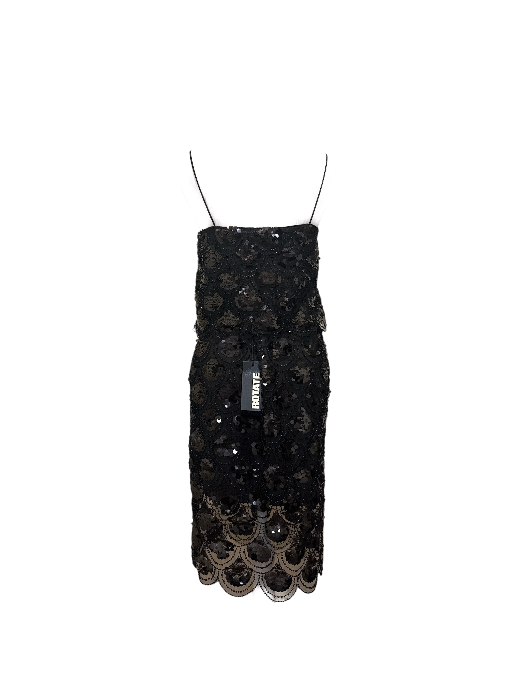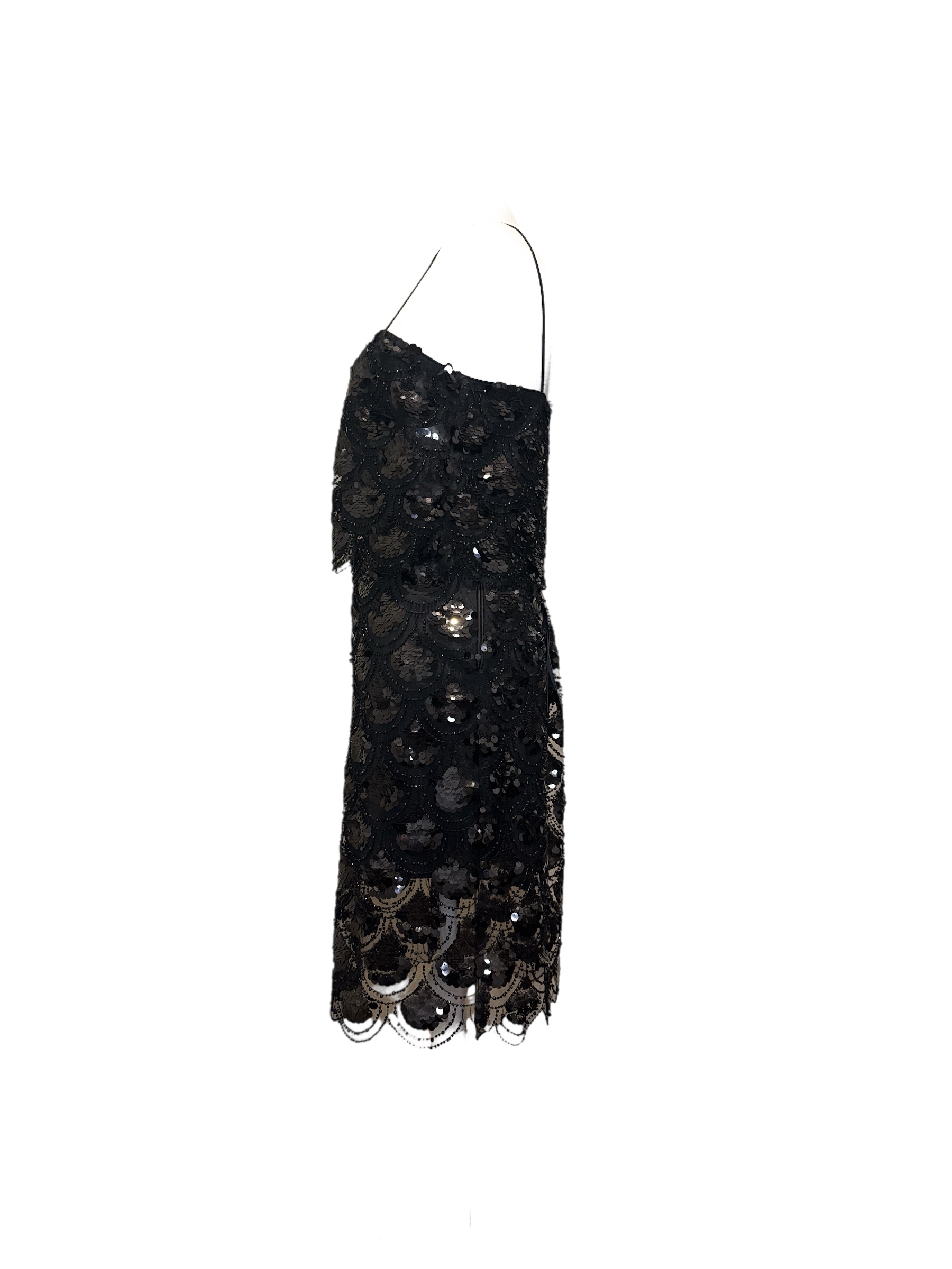 Completo nero con spalline sottili interamente decorato da paillettes e d’eco con motivo a scaglie. Scollo dritto.