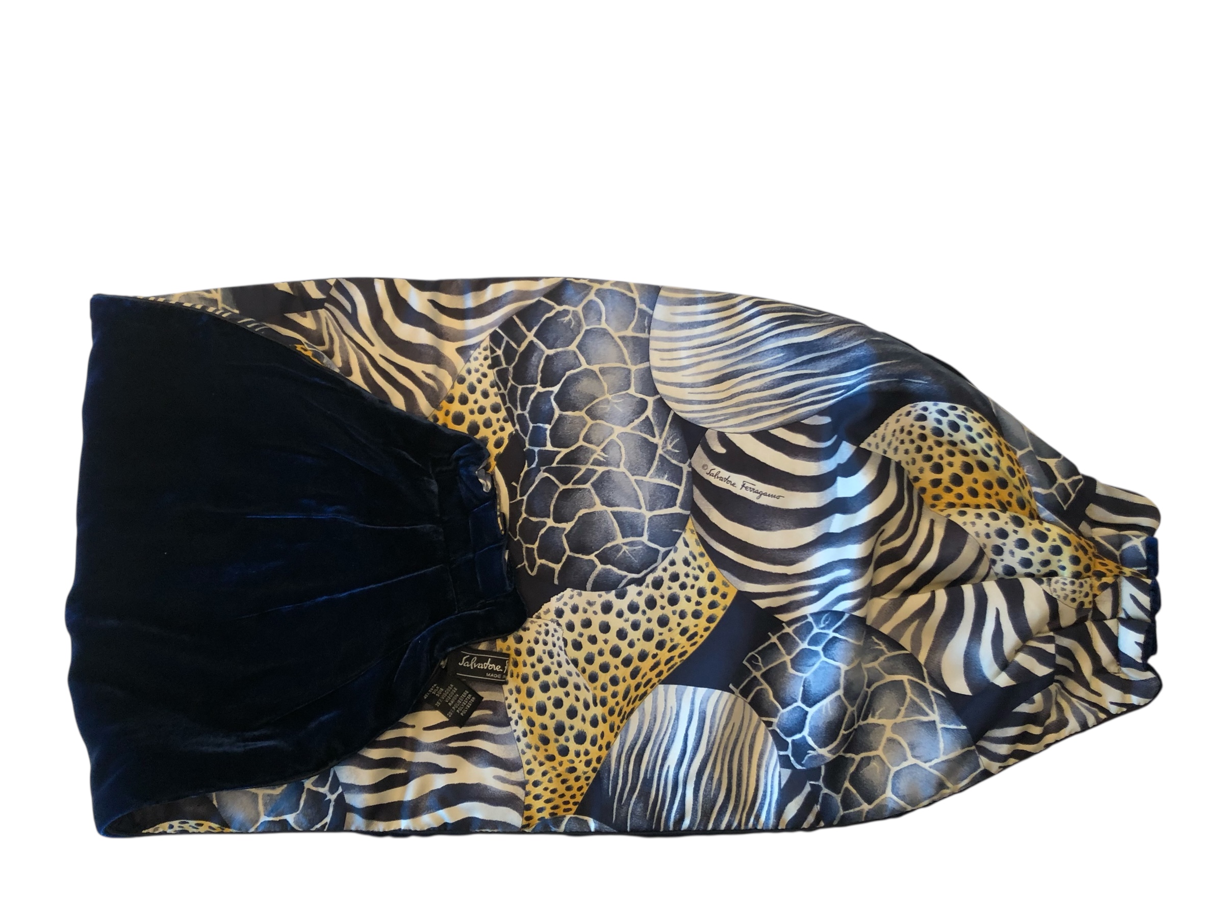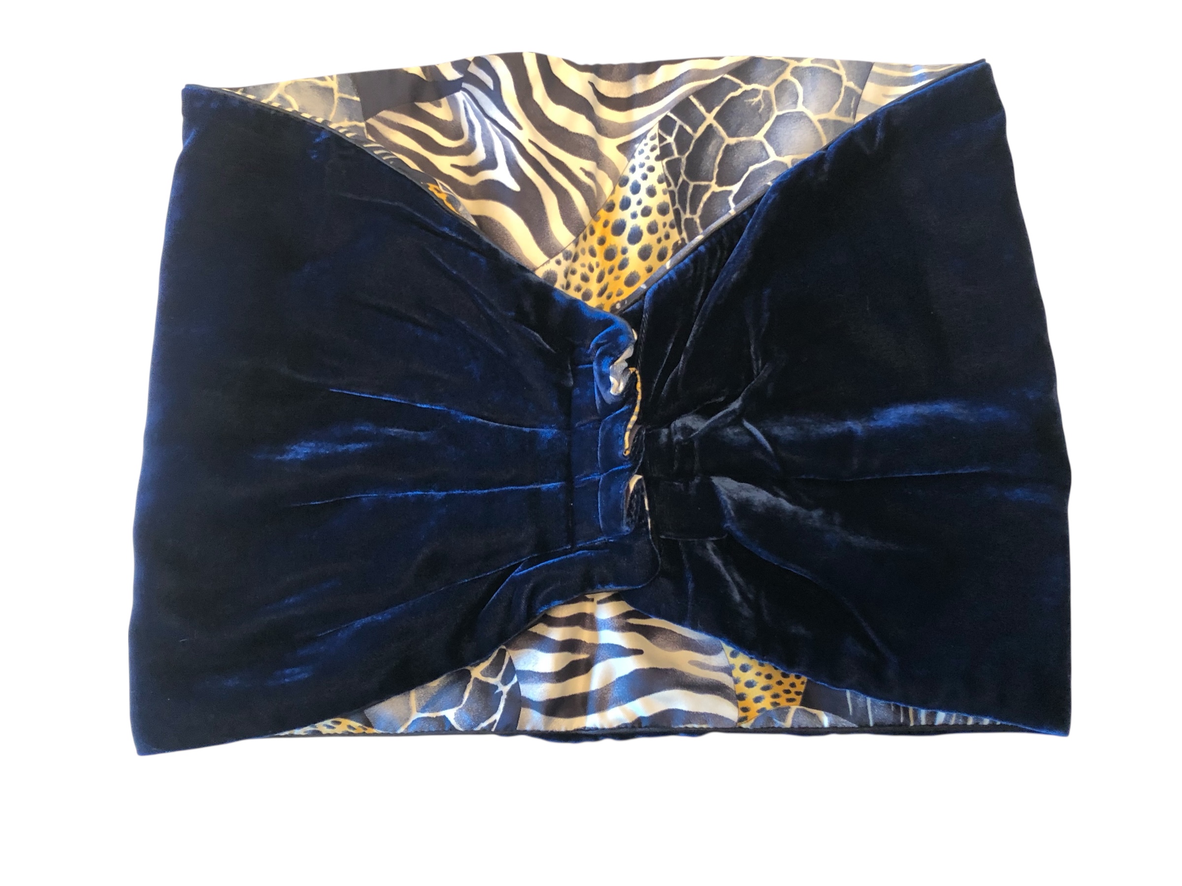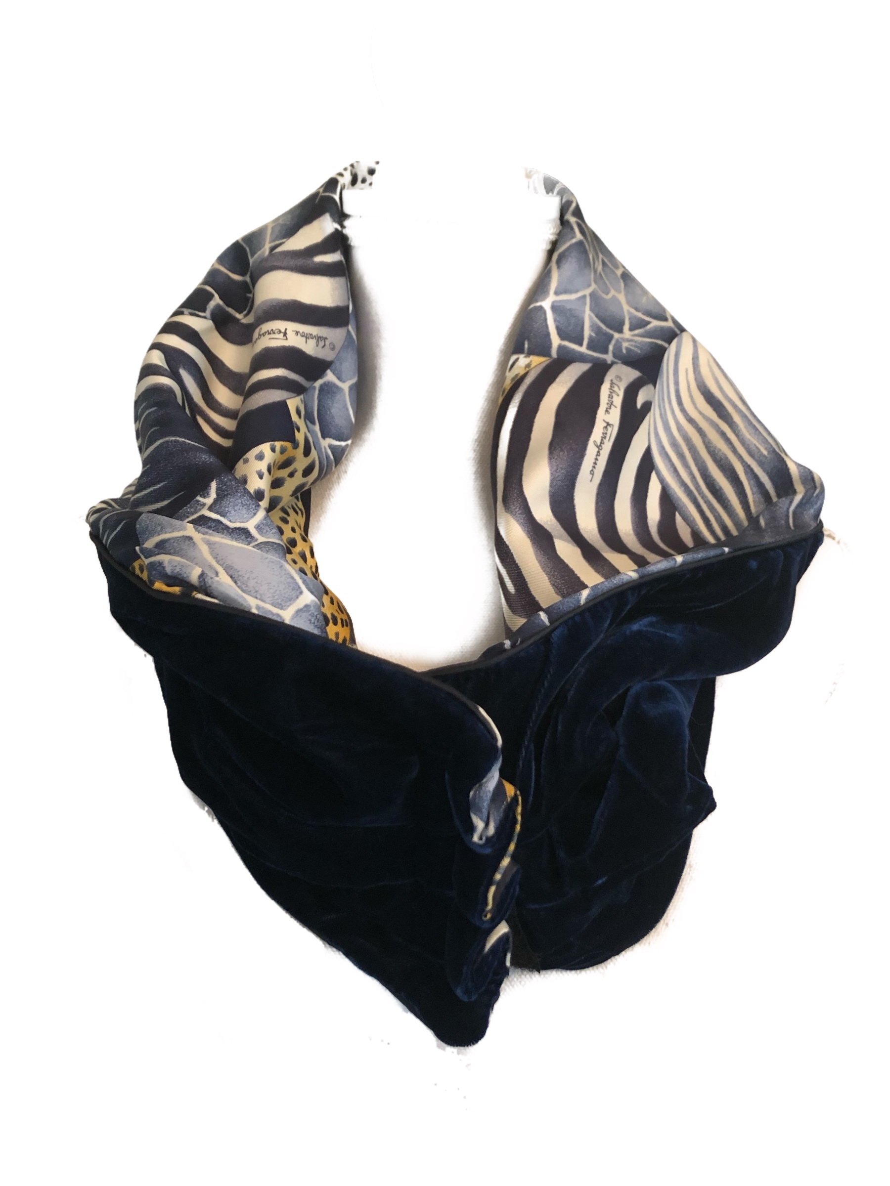 Sciarpa o scoldacollo composto da 2 tessuti diversi: la parte interna in seta stampata animalier, mentre la parte esterna è in velluto blu scuro.