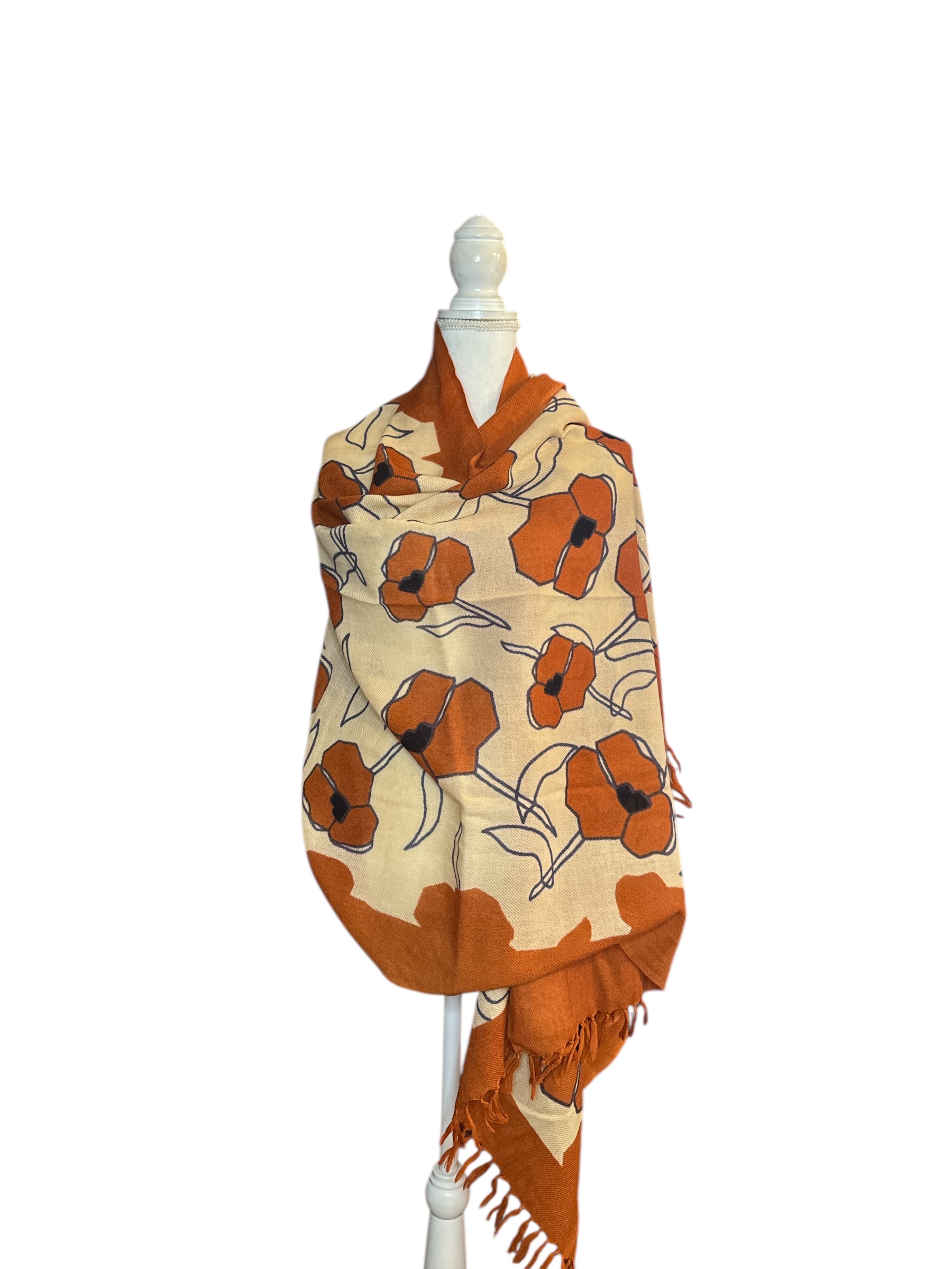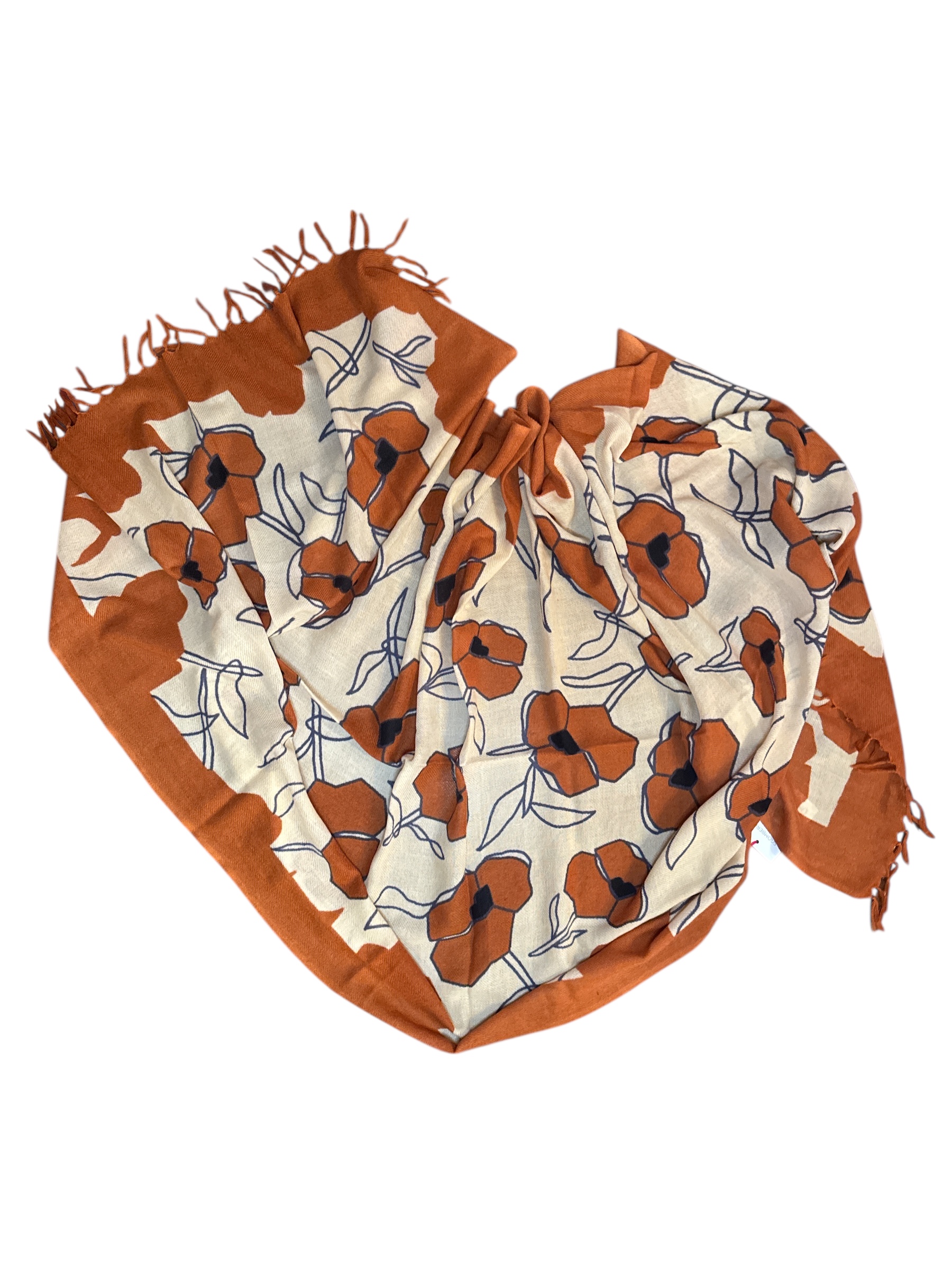 Stola con stampa floreale stilizzata. Fondo color avorio decorata con grandi fiori arancio bruciato. Piccole frange alle estremità.