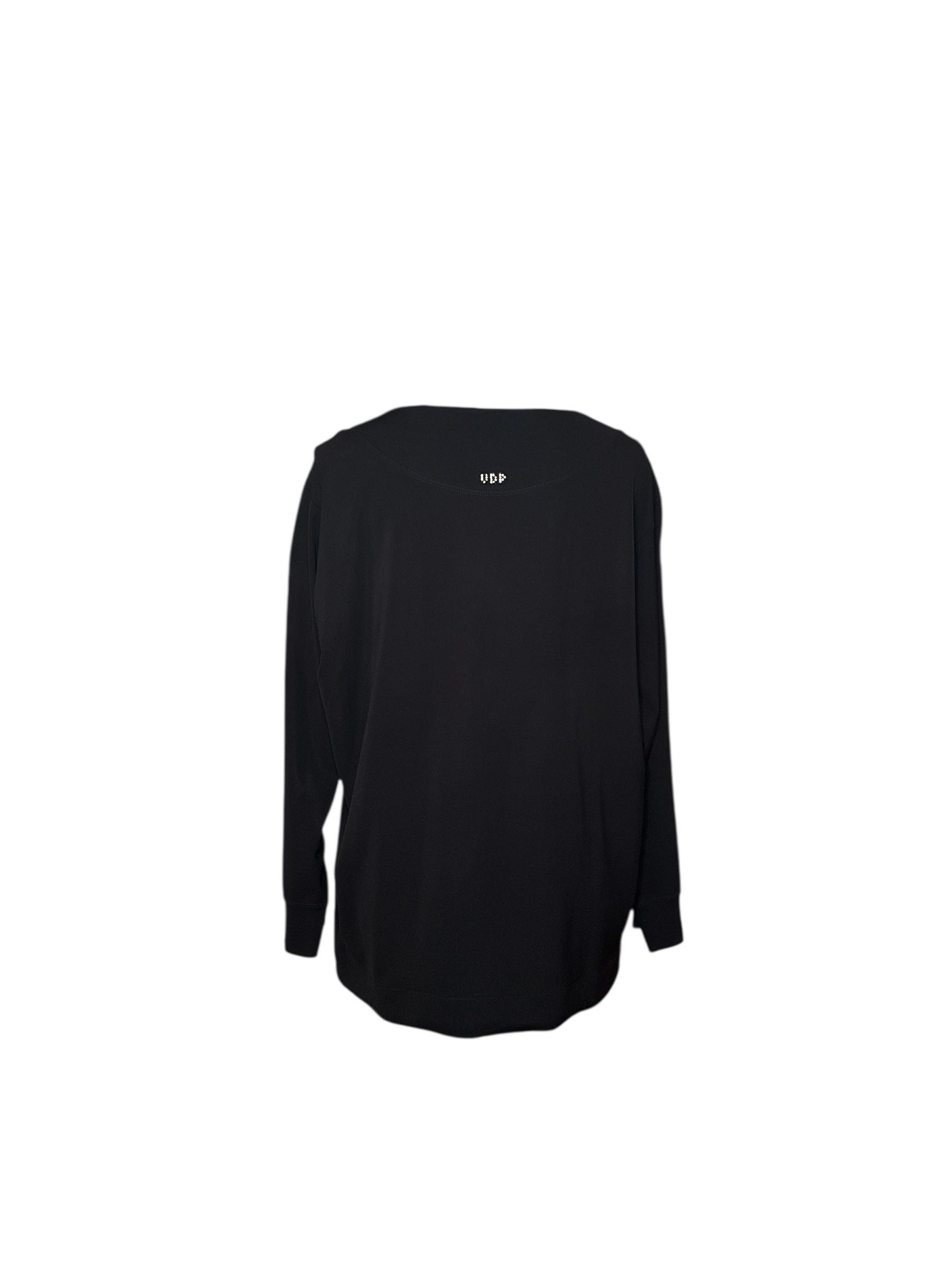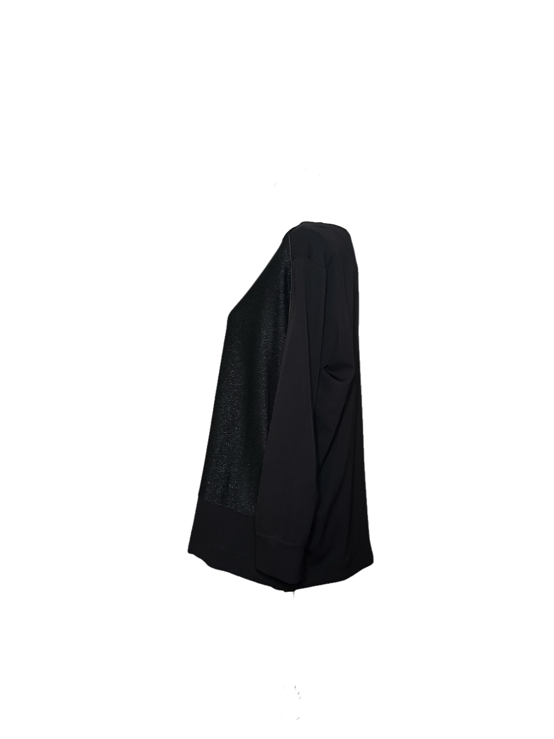 Maglia in tessuto laminato e brillante con scollatura arrotondata, decorata da un profilo di strass. Maniche lunghe finitura al fondo con coulisse regolabile.